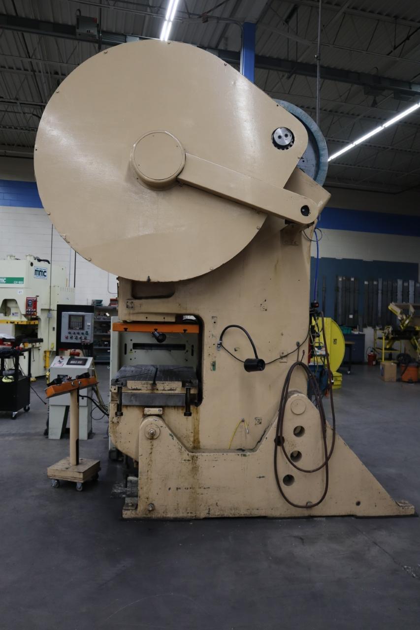 Tonnage Capacity: 150 Ton Stroke Length: 6" Drive Type: Back Geared Shut Height (SDAU): 12.5" Slide Adjustment: 4" Bed Size: 47.5 x 30 Ram Size: 36 x 30 Strokes Per Minute: 40 Equipped With: Rockford SSC-1500 Part Revolution Controls, Dual Palm Buttons, Back Geared, 6" Stroke, Air Clutch and Brake, Inch/Single/Continuous, Rowe PM-LT3-224 24" PRess Feeder (Feeder Max Thickness .093" Mild Steel), Dayton Rogers HC-16 Air Cushion (8" Stroke), Shuttle Pro 450 NOTE: Flywheel, Clutch and Brake Assembly Rebuilt and UPdated by Bliss and installed by PressLine Industries in 2024! Electrics: 220 Volt, 3 Phase |