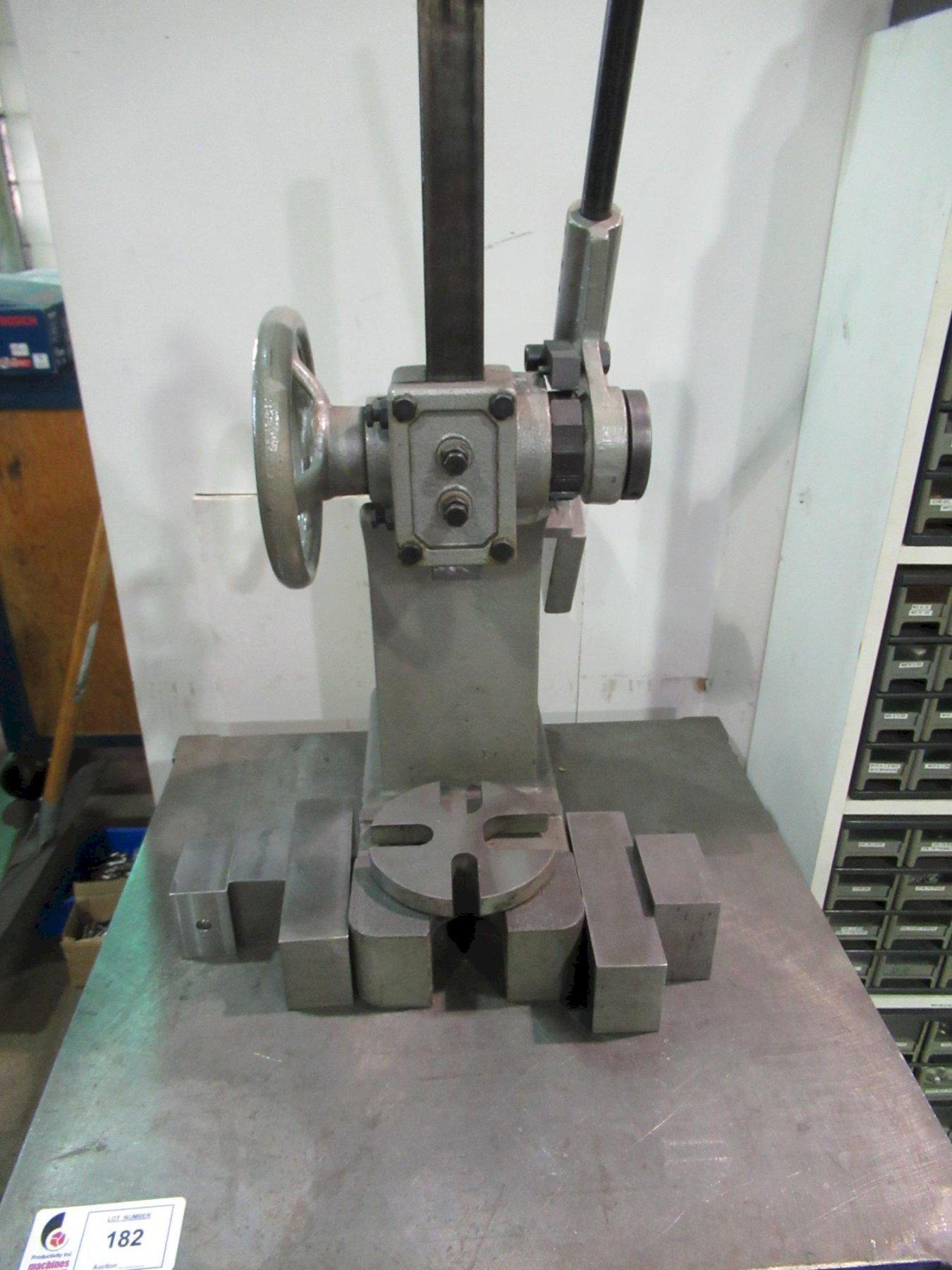 Lot 182: Ratcheting Arbor Press, 6" Throat, 12" Throat Height on Portable Metal Frame Shop Cart with Contents Manufacturer: Generic Model: Generic Main Unit Approx Weight: 0.00 lbs Main Unit Dimensions (in inches): Length: 0.00" Width: 0.00" Height: 0.00" Specs: Seller Company: GB Tool Inc Seller Contact: Machinesused.com GBTool Phone: (763) 745-1166 Item Location: GB Tool Inc, 1580 93rd NE, Blaine, MN 55449 Location Contact: Machinesused.com GBTool Phone: (763) 745-1166 Inspection Date & Time: Friday, January 9, 2026 9AM-4PM Dock Door: 144" x 144" Ground | 96" x 120"H Truck Level (48"H) Dock Door Loading Dock: Ground Level, and Truck Level Doors, Paved Lot Removal Dates and Times: This item must be removed between Monday, January 19, 2026 and Wednesday, January 21, 2026