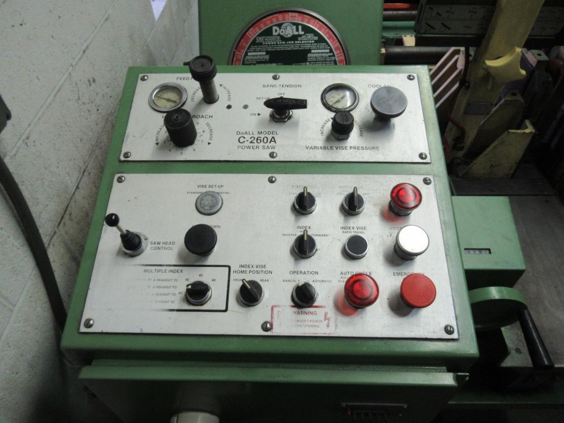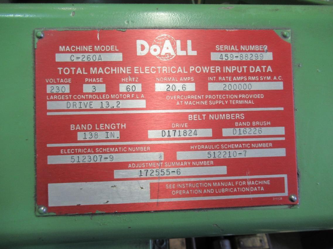 Lot 60: DoAll C-260 Horizontal Automatic Band Saw Equipped With: Automatic Cycle, Fixed Front Vise, Rear Shuttle Vise, Manual Or Automatic Operation, Chip Auger, In-Base Coolant, Parts Counter, Discharge Tray, Oil Mister, 5 HP Drive Motor, Manuals and Documentation Electrics: 230 Volt, 3 Phase Manufacturer: DoAll Model: C-260A Year: 1988 Serial Number: 459-88299 Main Unit Approx Weight: 4300.00 lbs Main Unit Dimensions (in inches): Length: 86.00" Width: 81.00" Height: 50.00" Specs: Table Height: 23" Blade Wheel Diameter: 12" Round Work Capacity: 10-1/4" Square Work Capacity: 10-1/4" X 12" Max Blade Size: 138" X 1-1/4" X .042" Blade Speeds: ( Variable ) 60 To 350 Fpm Stock Feed Shuttle Travel: 0-24" Number of Shuttle Indexes: 4 Multi-Index Drive Motor: 5 HP Max Vise Opening: 12" Seller Company: GB Tool Inc Seller Contact: Machinesused.com GBTool Phone: (763) 745-1166 Item Location: GB Tool Inc, 1580 93rd NE, Blaine, MN 55449 Location Contact: Machinesused.com GBTool Phone: (763) 745-1166 Inspection Date & Time: Friday, January 9, 2026 9AM-4PM Dock Door: 144" x 144" Ground | 96" x 120"H Truck Level (48"H) Dock Door Loading Dock: Ground Level, and Truck Level Doors, Paved Lot Removal Dates and Times: This item must be removed between Monday, January 19, 2026 and Wednesday, January 21, 2026