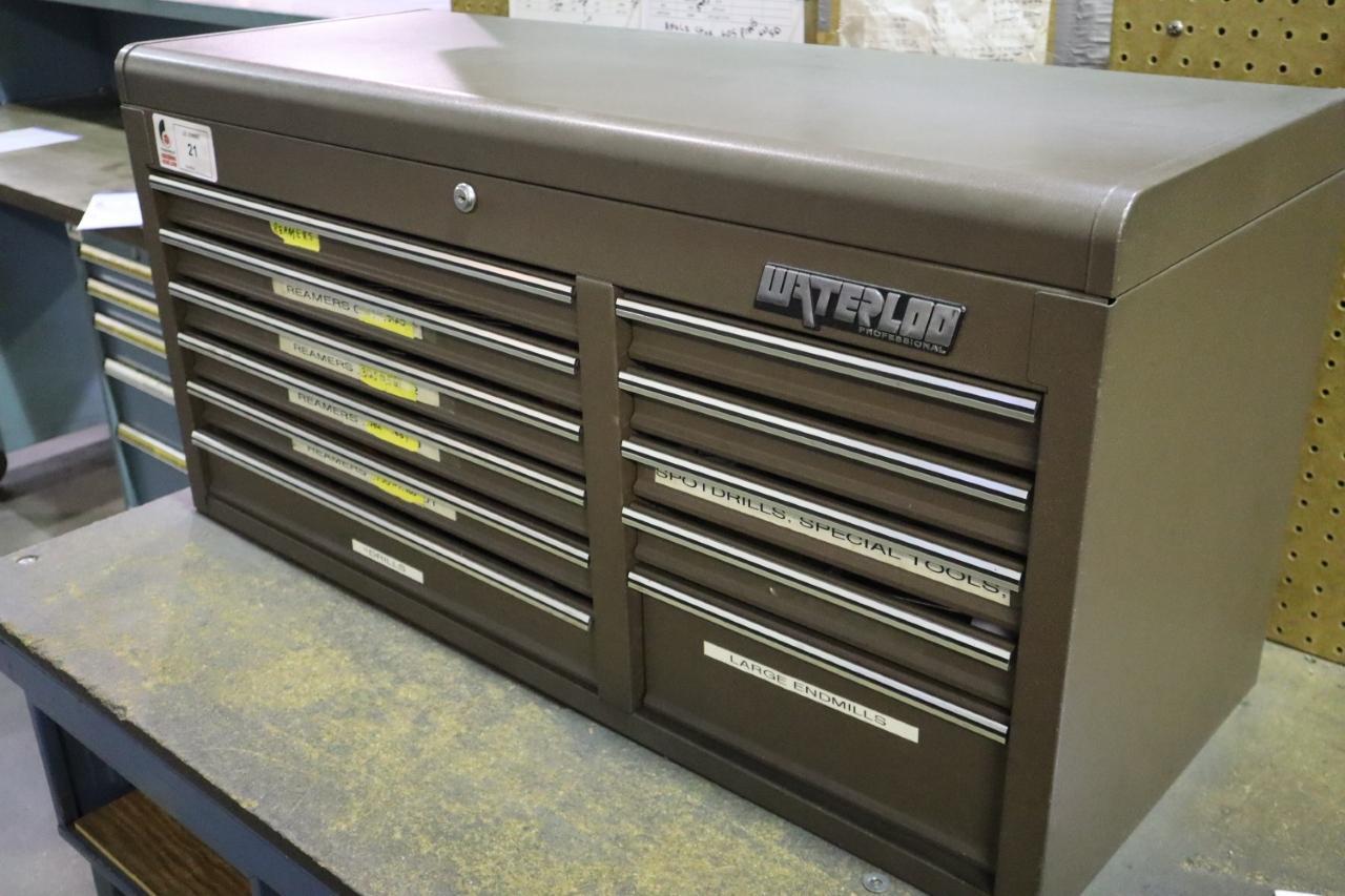 Lot 21: Waterloo Tool Cabinet with Contents, 11 Drawer Equipped With: Hand Tools, Perishable Cutting Tools, Micrometers, etc... Manufacturer: Waterloo Model: Generic Main Unit Approx Weight: 0.00 lbs Main Unit Dimensions (in inches): Length: 40.50" Width: 16.00" Height: 20.00" Seller Company: GB Tool Inc Seller Contact: Machinesused.com GBTool Phone: (763) 745-1166 Item Location: GB Tool Inc, 1580 93rd NE, Blaine, MN 55449 Location Contact: Machinesused.com GBTool Phone: (763) 745-1166 Inspection Date & Time: Friday, January 9, 2026 9AM-4PM Dock Door: 144" x 144" Ground | 96" x 120"H Truck Level (48"H) Dock Door Loading Dock: Ground Level, and Truck Level Doors, Paved Lot Removal Dates and Times: This item must be removed between Monday, January 19, 2026 and Wednesday, January 21, 2026