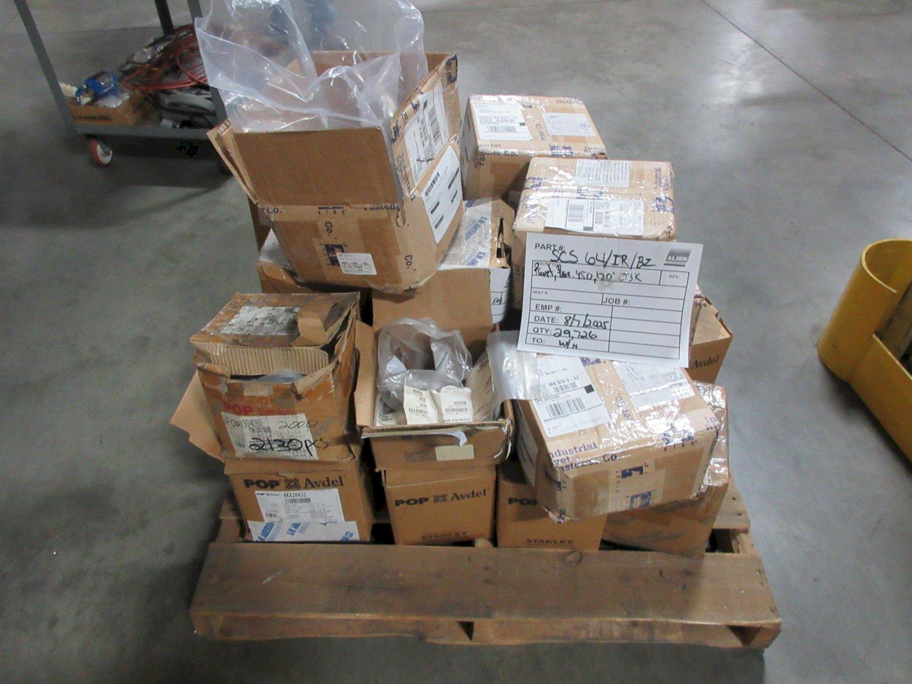 Lot 519: Pop Rivets Many Boxes, Assorted Sizes and Brands on Pallet Manufacturer: Generic Model: Generic Main Unit Approx Weight: 0.00 lbs Main Unit Dimensions (in inches): Length: 42.00" Width: 42.00" Height: 32.00" Seller Company: Aljon Tool, Inc. Seller Contact: Machinesused.com Aljon Phone: (763) 745-1166 Item Location: Aljon Tool, Inc., 15700 28th. Ave. No., Plymouth, MN 55447 Location Contact: Machinesused.com Aljon Phone: (763) 745-1166 Inspection Date & Time: Thursday-Friday, February 19-20, 2026 9AM-4PM Dock Door: 12' x 14' H Door Ground Level Doors Loading Dock: Ground Level and Truck Cock Level Doors Removal Dates and Times: This item must be removed between Monday, March 2, 2026 and Friday, March 6, 2026