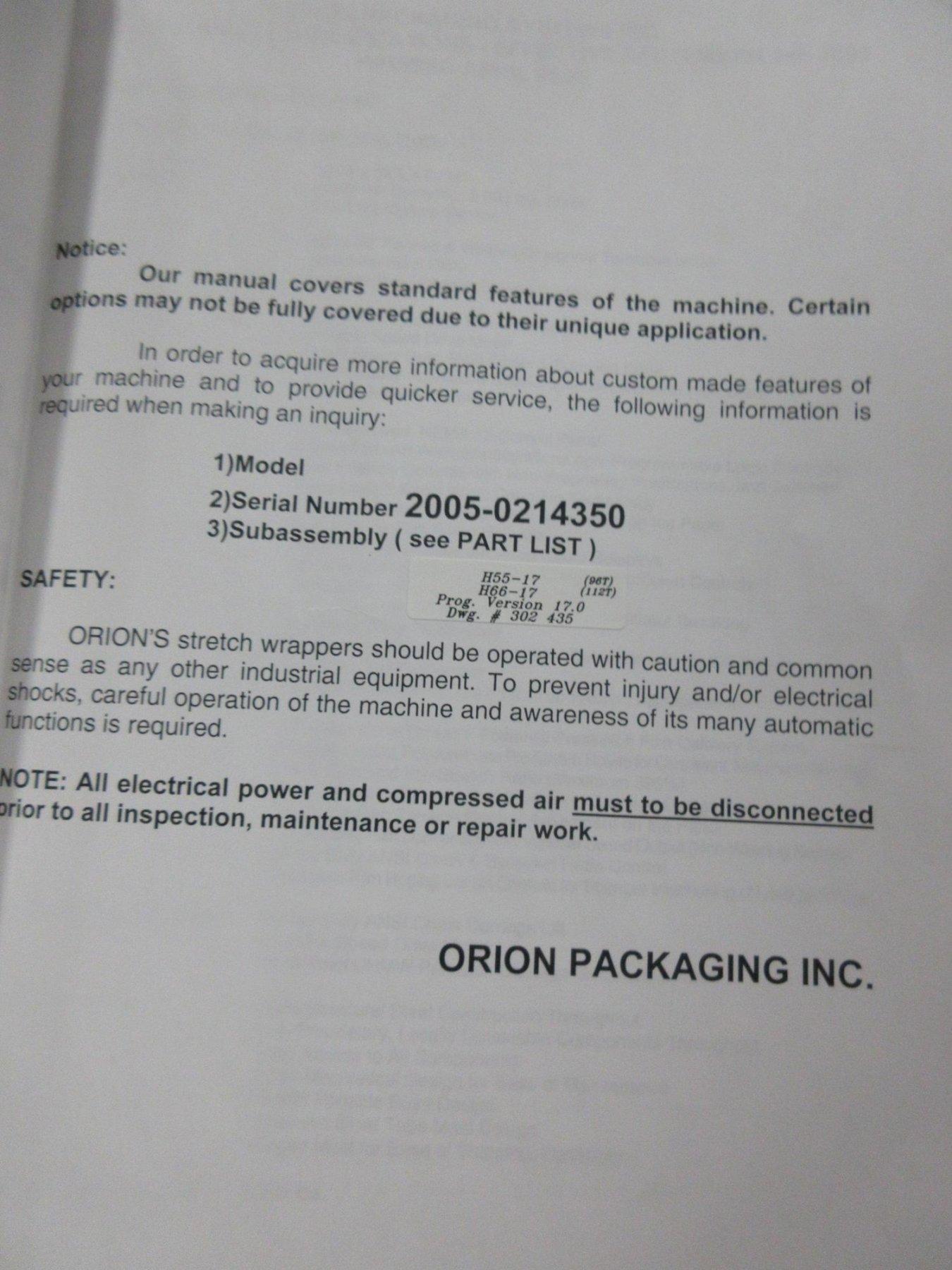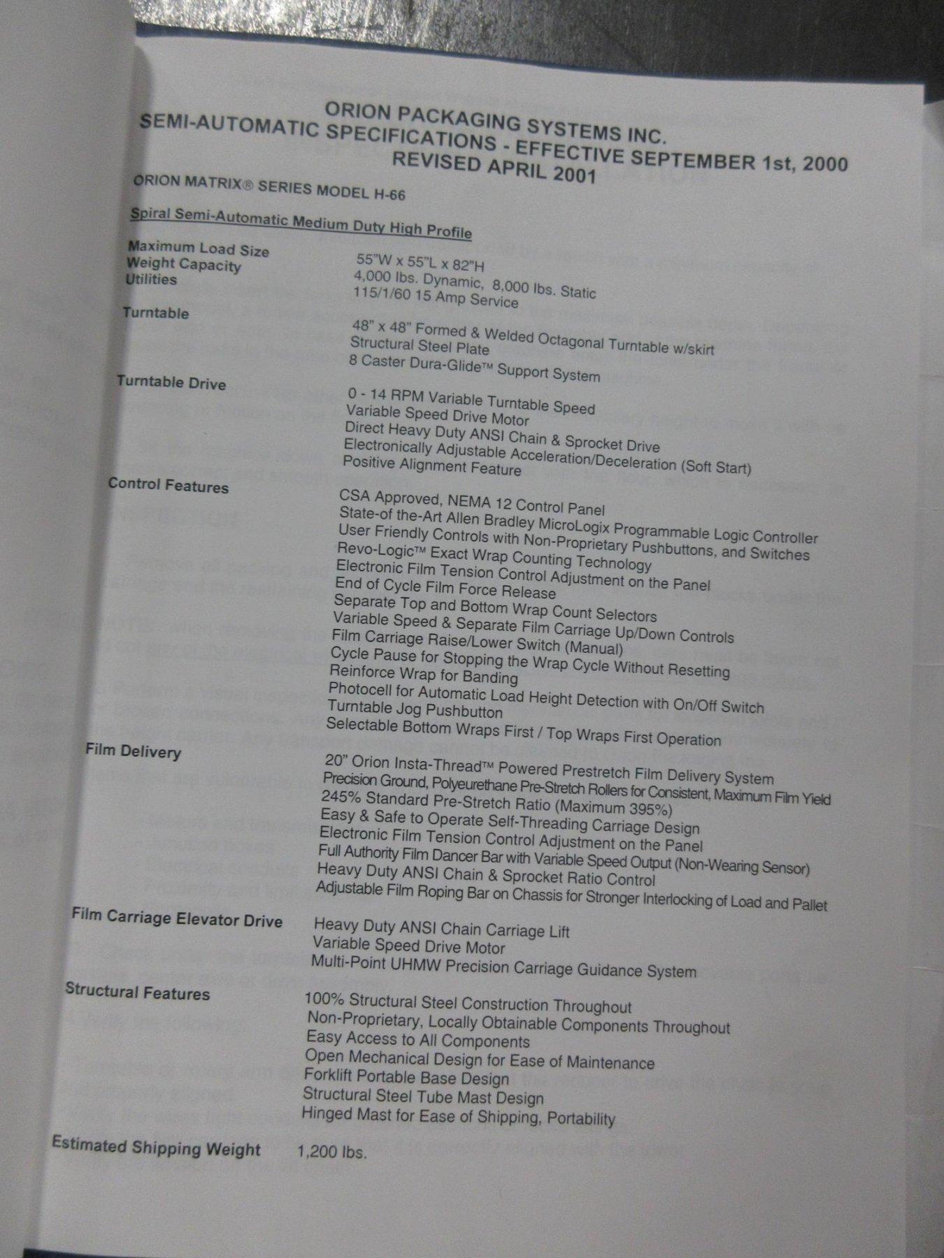 Lot 545: Orion Packaging Inc. Semi Automatic Shrink Wrapper and Pallet Scale, Max Load 55"x55"x82" 4000lbs Dynamic, 8000lb Static Capacity Equipped With: 48" x 48" Turntable, 0-14rpm Variable Speed, Nema 12 Control Panel, 20" Orion Insta-Thread Powered Stretch Film Delivery System, Electrics: 110V Single Phase Manufacturer: Orion Matrix Model: H-66 Main Unit Approx Weight: 0.00 lbs Main Unit Dimensions (in inches): Length: 0.00" Width: 0.00" Height: 0.00" Components: Turntable: Length: 56.00" Width: 56.00" Height: 16.00" Shrink Wrapper: Length: 40.00" Width: 48.00" Height: 84.00" Wall Mount Digital Readout: Length: 8.00" Width: 5.00" Height: 8.00" Seller Company: Aljon Tool, Inc. Seller Contact: Machinesused.com Aljon Phone: (763) 745-1166 Item Location: Aljon Tool, Inc., 15700 28th. Ave. No., Plymouth, MN 55447 Location Contact: Machinesused.com Aljon Phone: (763) 745-1166 Inspection Date & Time: Thursday-Friday, February 19-20, 2026 9AM-4PM Dock Door: 12' x 14' H Door Ground Level Doors Loading Dock: Ground Level and Truck Cock Level Doors Removal Dates and Times: This item must be removed between Monday, March 2, 2026 and Friday, March 6, 2026