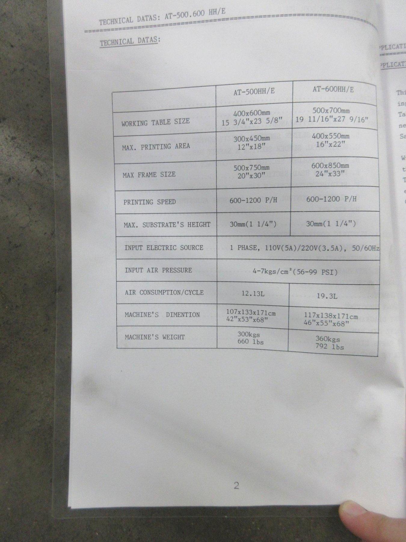 Lot 500: ATMA Pneumatic Euro-Spec Sliding Table Screen Printer Equipped With: Pneumatic Squeegee, Working Table Size 19-11/16" x 27-9/16", Printing Speed 600-1200 P/H, Remote Foot Trip, Tool Box and Manual Electrics: 110V Single Phase Manufacturer: ATMA Model: AT-EI600H Serial Number: 811765 Main Unit Approx Weight: 800.00 lbs Main Unit Dimensions (in inches): Length: 50.00" Width: 38.00" Height: 67.00" Seller Company: Aljon Tool, Inc. Seller Contact: Machinesused.com Aljon Phone: (763) 745-1166 Item Location: Aljon Tool, Inc., 15700 28th. Ave. No., Plymouth, MN 55447 Location Contact: Machinesused.com Aljon Phone: (763) 745-1166 Inspection Date & Time: Thursday-Friday, February 19-20, 2026 9AM-4PM Dock Door: 12' x 14' H Door Ground Level Doors Loading Dock: Ground Level and Truck Cock Level Doors Removal Dates and Times: This item must be removed between Monday, March 2, 2026 and Friday, March 6, 2026