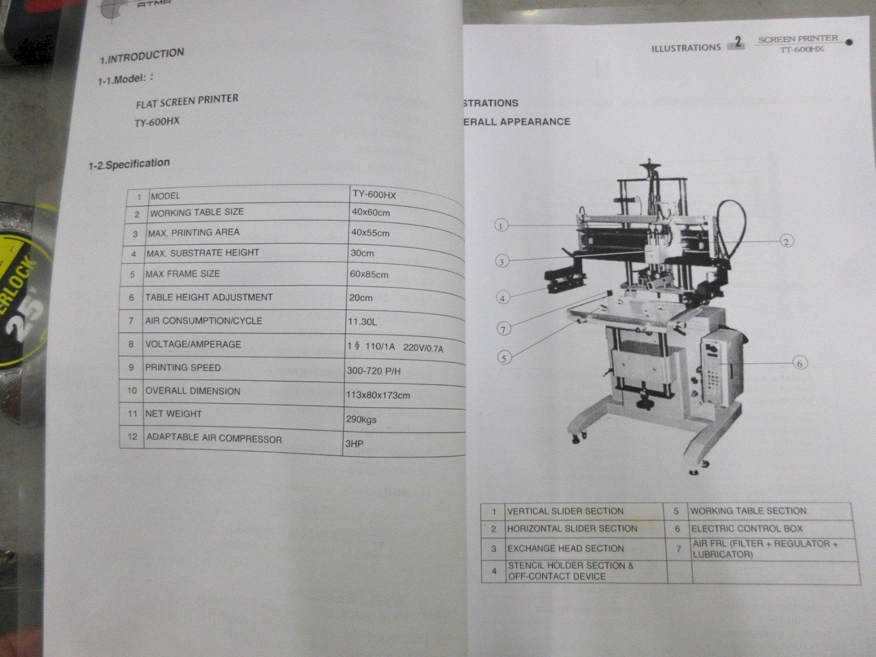 Lot 505: ATMA Pneumatic Tall Stereo Substrate Printing Machine Model TY-600HX Equipped With: Working Table Size 40 x 60cm, Max Printing Area 40 x 55cm, Printing Speed 300-720 p/H, Remote Foot Trip, Control Panel Electrics: 110V Single Phase Manufacturer: ATMA Model: TY-600HX Serial Number: A050700102 Main Unit Approx Weight: 552.00 lbs Main Unit Dimensions (in inches): Length: 48.00" Width: 36.00" Height: 69.00" Seller Company: Aljon Tool, Inc. Seller Contact: Machinesused.com Aljon Phone: (763) 745-1166 Item Location: Aljon Tool, Inc., 15700 28th. Ave. No., Plymouth, MN 55447 Location Contact: Machinesused.com Aljon Phone: (763) 745-1166 Inspection Date & Time: Thursday-Friday, February 19-20, 2026 9AM-4PM Dock Door: 12' x 14' H Door Ground Level Doors Loading Dock: Ground Level and Truck Cock Level Doors Removal Dates and Times: This item must be removed between Monday, March 2, 2026 and Friday, March 6, 2026