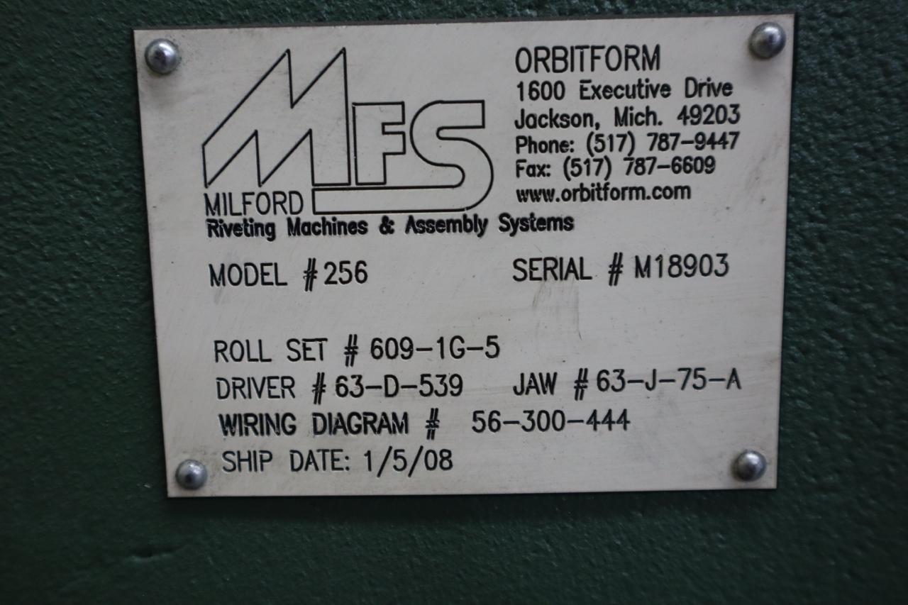 Lot 309: Milford Orbitform #256 Riveter, 12" Throat, Remote Foot Trip and Tooling Equipped With: 12" Throat, Remote Foot Trip, Electrics: 115V Single Phase Manufacturer: Generic Model: Generic Year: 2008 Serial Number: M18903 Main Unit Approx Weight: 0.00 lbs Main Unit Dimensions (in inches): Length: 23.00" Width: 30.00" Height: 69.00" Seller Company: Aljon Tool, Inc. Seller Contact: Machinesused.com Aljon Phone: (763) 745-1166 Item Location: Aljon Tool, Inc., 15700 28th. Ave. No., Plymouth, MN 55447 Location Contact: Machinesused.com Aljon Phone: (763) 745-1166 Inspection Date & Time: Thursday-Friday, February 19-20, 2026 9AM-4PM Dock Door: 12' x 14' H Door Ground Level Doors Loading Dock: Ground Level and Truck Cock Level Doors Removal Dates and Times: This item must be removed between Monday, March 2, 2026 and Friday, March 6, 2026