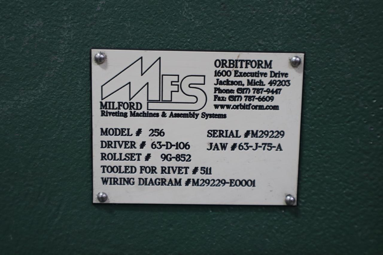 Lot 418: Milford Orbitform #256 Riveter, Feed Bowl, Tooling, Remote Foot Trip Electrics: 115 Volt, Sinlge Phase Manufacturer: Milford Orbitform Model: 256 Serial Number: M29229 Main Unit Approx Weight: 0.00 lbs Main Unit Dimensions (in inches): Length: 36.00" Width: 36.00" Height: 72.00" Seller Company: Aljon Tool, Inc. Seller Contact: Machinesused.com Aljon Phone: (763) 745-1166 Item Location: Aljon Tool, Inc., 15700 28th. Ave. No., Plymouth, MN 55447 Location Contact: Machinesused.com Aljon Phone: (763) 745-1166 Inspection Date & Time: Thursday-Friday, February 19-20, 2026 9AM-4PM Dock Door: 12' x 14' H Door Ground Level Doors Loading Dock: Ground Level and Truck Cock Level Doors Removal Dates and Times: This item must be removed between Monday, March 2, 2026 and Friday, March 6, 2026