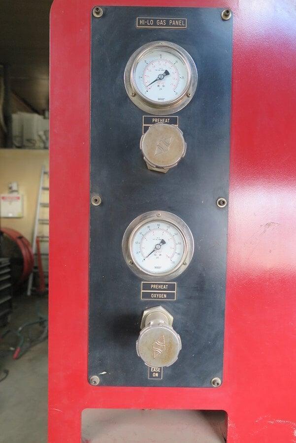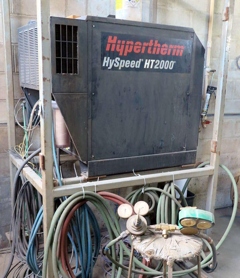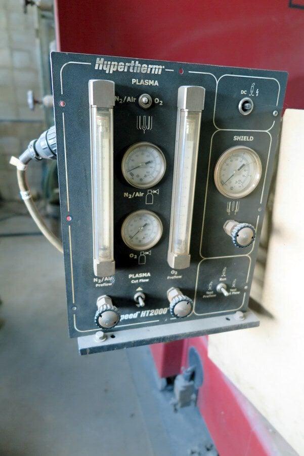 INCLUDES: Hypertherm Hyspeed HT2000 200 Amp Air Plasma Source, (1) Oxy-Fuel Cutting Torch, Hypertherm Voyager II CNC Controller, Gas Console, Engraving Head and Slated Table.