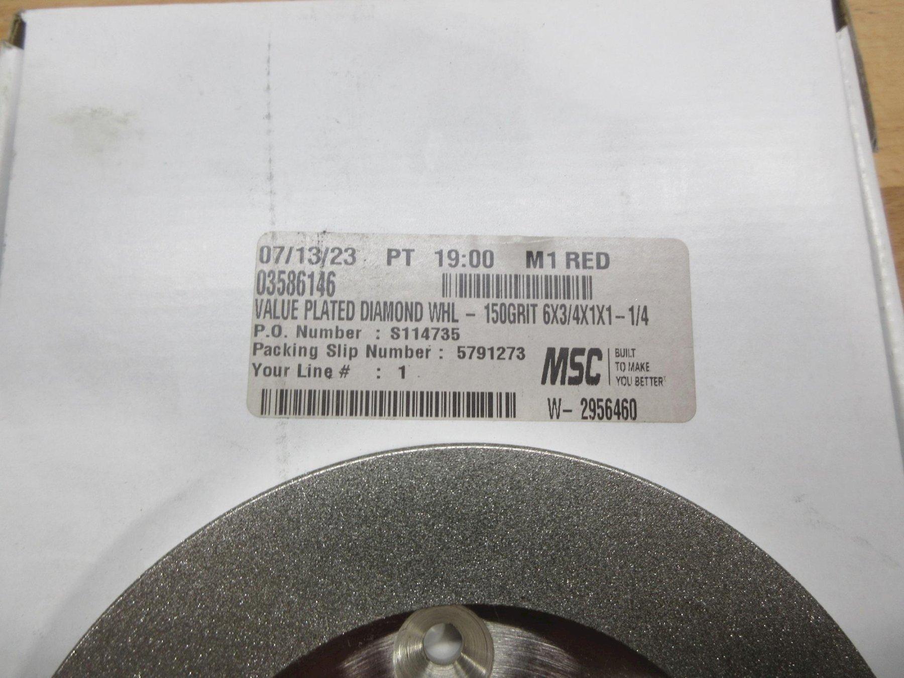 Lot 42: Tool & Cutting Grinding Wheel: 6" Dia, 150 Grit, 6x3/4x1x1-1/4, MSC #03586146, ** New in Package** Manufacturer: MSC Model: 03586146 Main Unit Approx Weight: 0.00 lbs Main Unit Dimensions (in inches): Length: 0.00" Width: 0.00" Height: 0.00" Specs: Seller Company: Regal Machine - South Seller Contact: Machinesused.com JanuaryMultiShop Phone: (763) 745-1166 Item Location: Machinesused.com, 2410 Niagara lane N, Plymouth, MN 55447 Location Contact: Machinesused.com JanuaryMultiShop Phone: (763) 745-1166 Inspection Date & Time: By Appointment Normal Business Hours Monday-Friday Dock Door: 12' x 12' Ground Level Door Loading Dock: Ground Level Removal Dates and Times: This item must be removed between Tuesday, January 27, 2026 and Friday, February 6, 2026