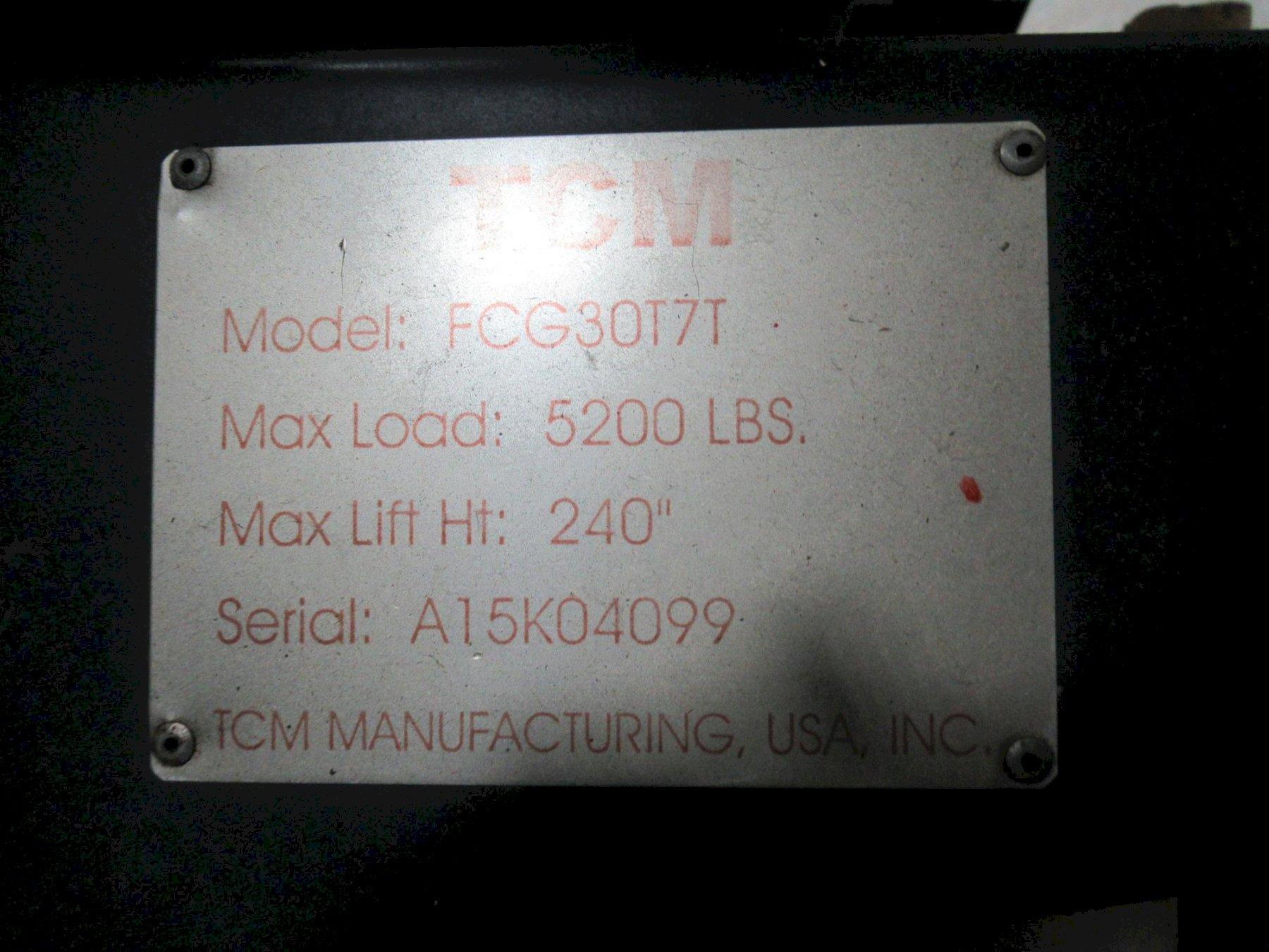 Lot 20: TCM FCG30T7T Forklift – 5,200 lb Capacity, Triple Mast, Side-Shift, Cushion-Tire, LPG Equipped With: Side-Shift, Mast Tilt, 240" max Lift Height , 48" Forks, Propane Engine, Cushion tires, Triple Mast, Safety Cage Description: Indoor-rated forklift with triple mast, side-shift, and 5,200 lb capacity. LPG power for clean indoor operation. Ideal for warehouses and machine shops. Manufacturer: TCM Model: FCG30T7T Serial Number: A15K04099 Main Unit Approx Weight: 9700.00 lbs Main Unit Dimensions (in inches): Length: 0.00" Width: 49.00" Height: 0.00" Seller Company: Exxact Tooling Seller Contact: Machinesused.com ExxactToolAuction Phone: (763) 745-1166 Item Location: Exxact Tooling, 3101 Industrial Dr #600, Faribault, MN 55021 Location Contact: Machinesused.com ExxactToolAuction Phone: (763) 745-1166 Inspection Date & Time: Friday, January 16, 2026 9AM-4PM Loading Dock: Ground Level Door, Paved Lot Removal Dates and Times: This item must be removed between Monday, January 26, 2026 and Tuesday, January 27, 2026