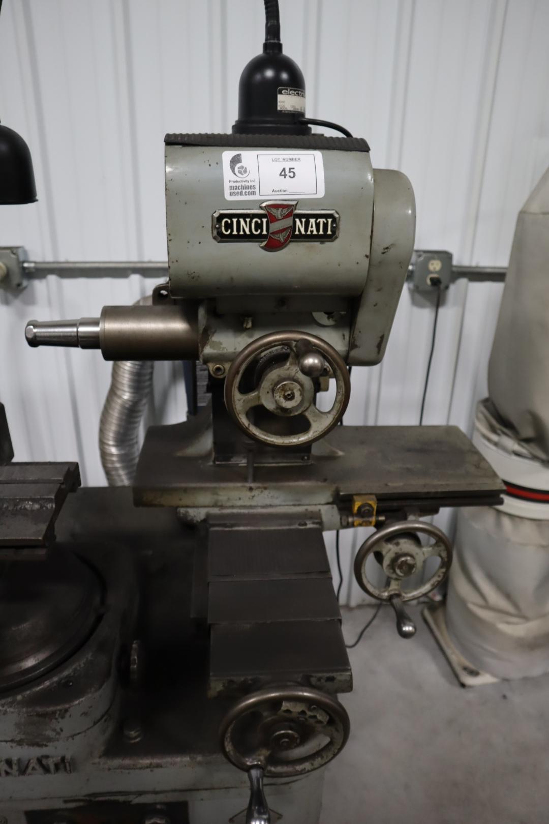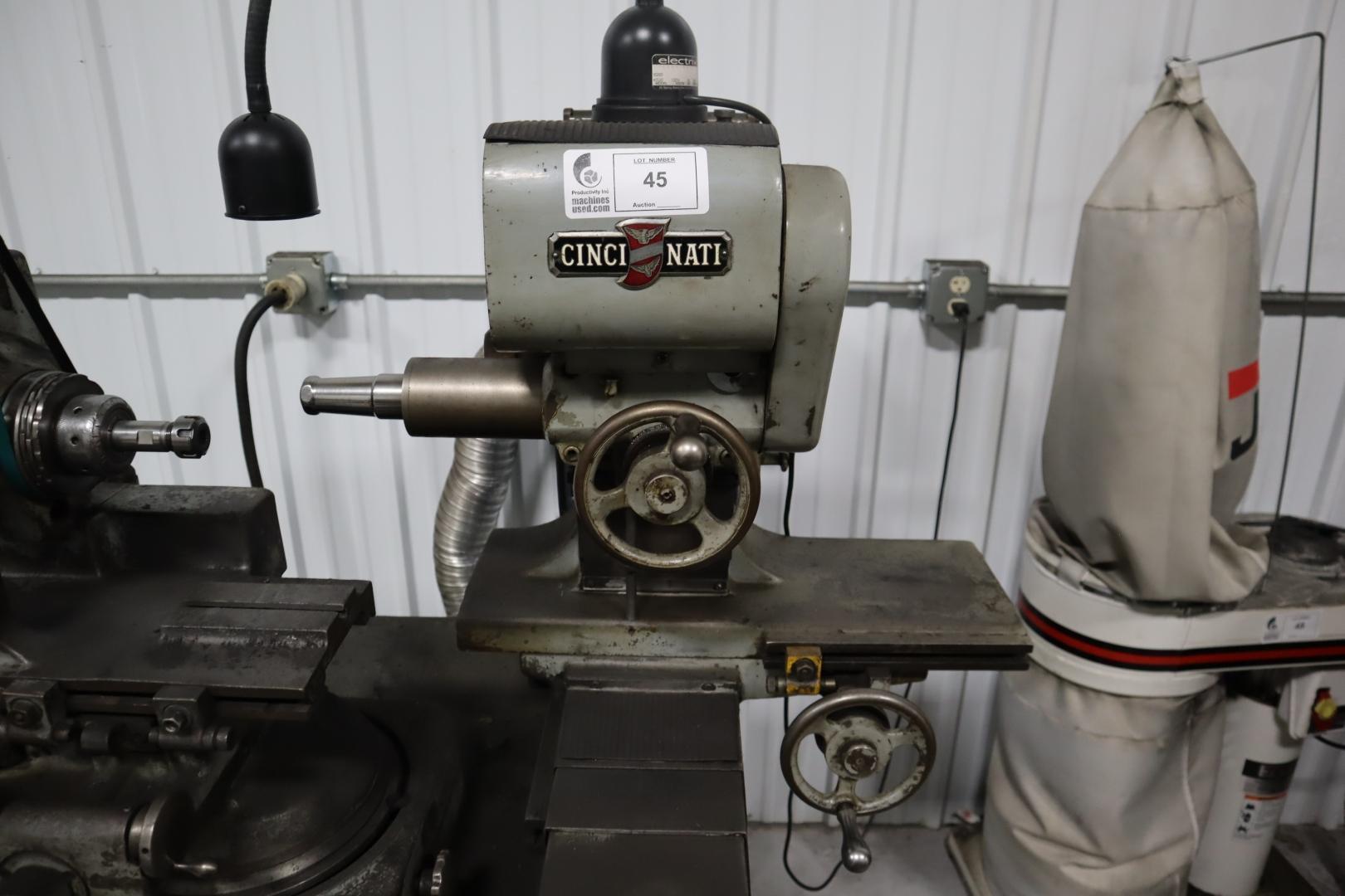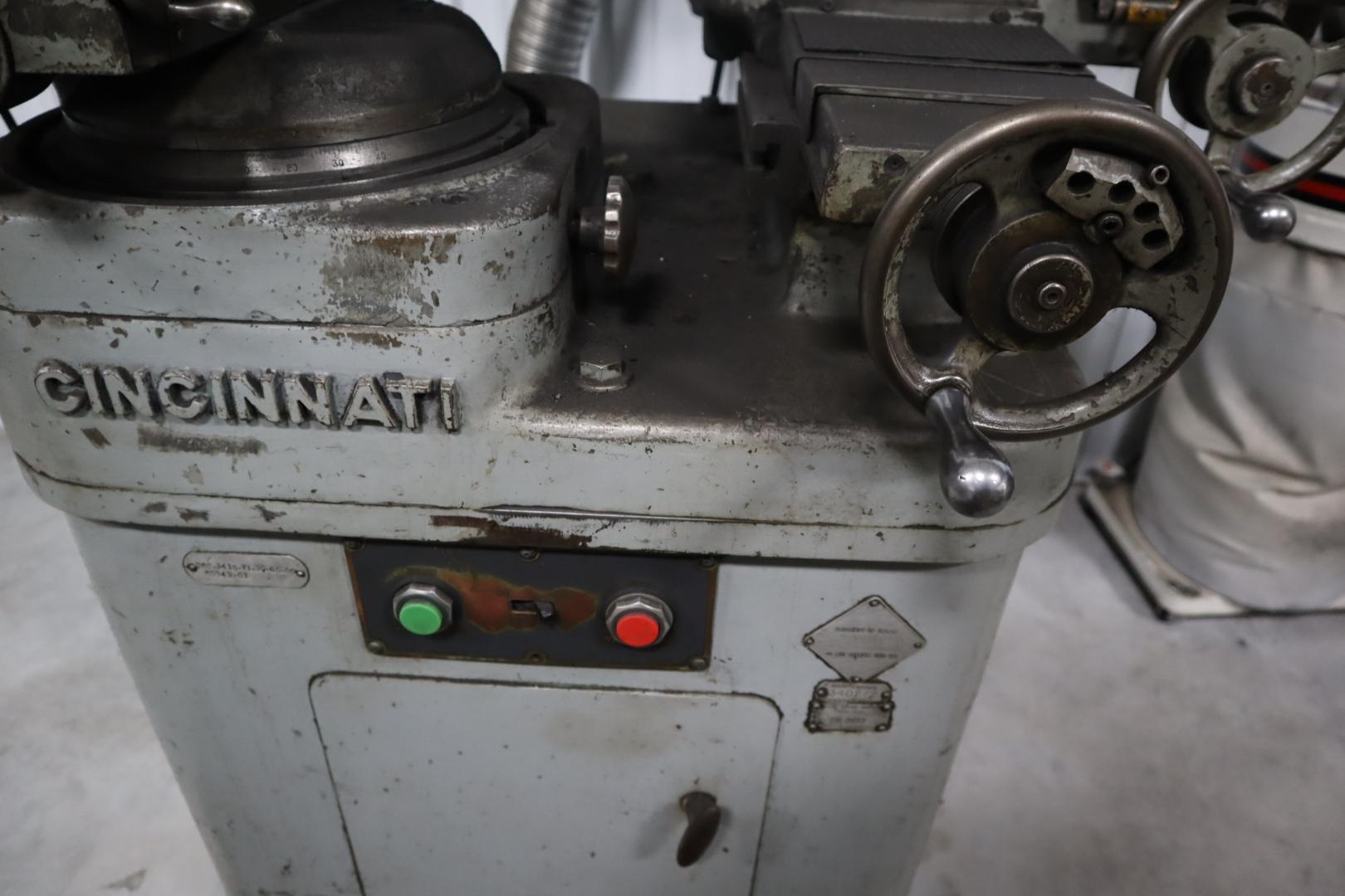 Lot 45: Cincinnati Monoset Tool and Cutter Grinder W/ Work Bench & Accessories Description: Second Cincinnati Monoset grinder offering unmatched flexibility in sharpening compound geometry cutters and precision form tools. Electrics: 230V 3-Phase Manufacturer: Cincinnati Model: MT Monoset Year: 1956 Serial Number: 2D1C5D-12 Main Unit Approx Weight: 1800.00 lbs Main Unit Dimensions (in inches): Length: 54.00" Width: 38.00" Height: 60.00" Specs: Swing Over Main Slide: 12" Collet Work Diameter Range: 1/8" to 1-1/4" Max Wheel Diameter: 4" Max Between Spindle Nose and Tail Center: 6" Longitudinal Movement of Main Slide: 5-3/4" Offset Slide Movement (Either Side of Center: 5-1/4" (2-1/4" Rear of Center & 3" Front of Center) Vertical Slid Travel of Wheelhead Above / Below Center: 4-1/4" / 4-1/2" Transverse Slide Travel of Wheelhead: 7-1/2" Longitudinal Slide Travel of Wheelhead: 6" Angular Range of Workhead in Horizontal / Vertical Plane: 235 Degrees / 80 Degrees Grinding Wheel Spindle Speeds: 4000, 5729 & 8000 RPM Workhead Spindle Speed: 436 RPM Vertical Head Movement: 9.5" (4.5" Above Center & 5" Below Center) Seller Company: Exxact Tooling Seller Contact: Machinesused.com ExxactToolAuction Phone: (763) 745-1166 Item Location: Exxact Tooling, 3101 Industrial Dr #600, Faribault, MN 55021 Location Contact: Machinesused.com ExxactToolAuction Phone: (763) 745-1166 Inspection Date & Time: Friday, January 16, 2026 9AM-4PM Loading Dock: Ground Level Door, Paved Lot Removal Dates and Times: This item must be removed between Monday, January 26, 2026 and Tuesday, January 27, 2026