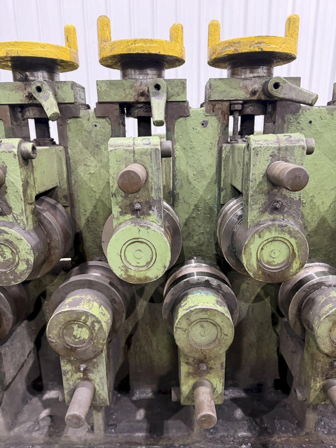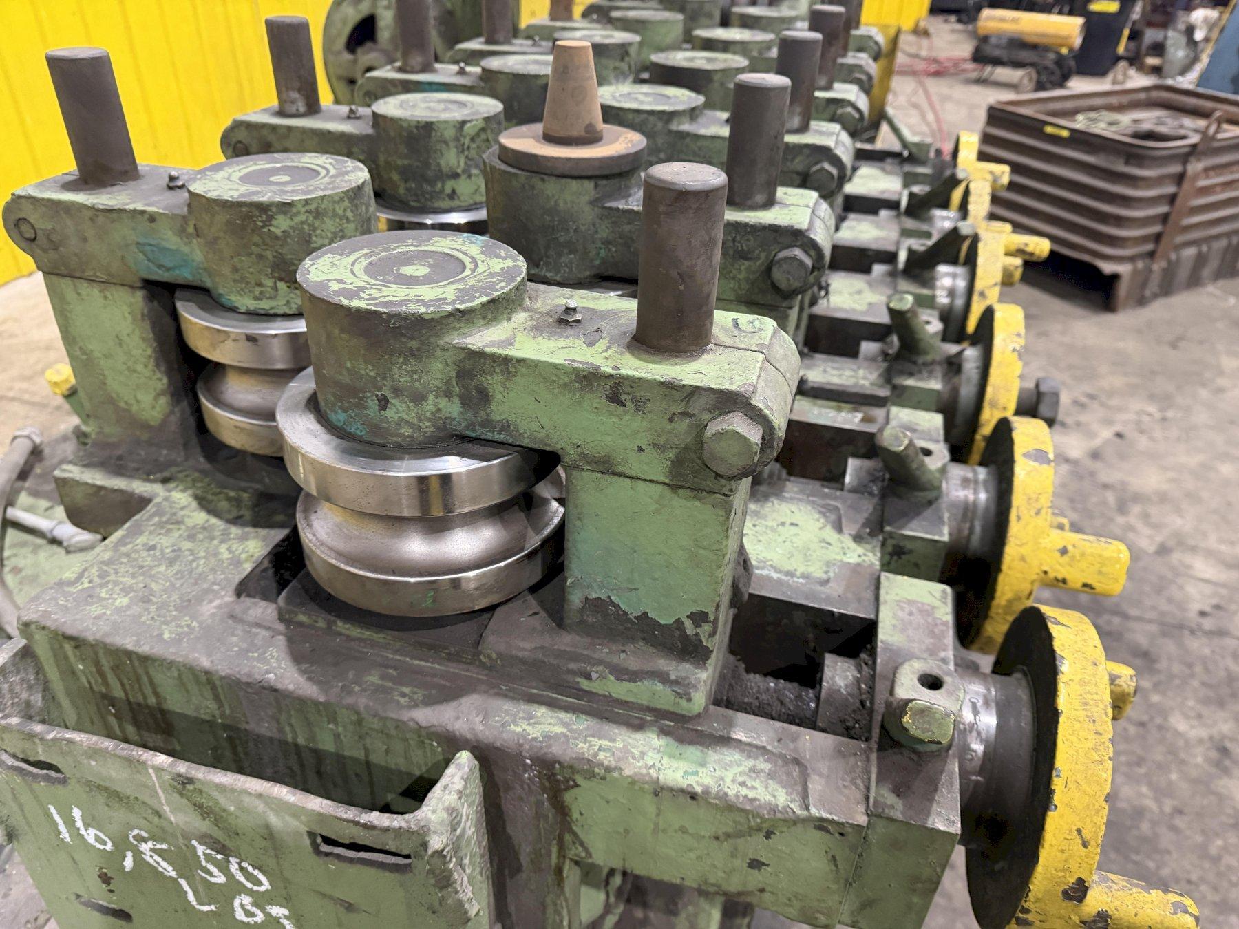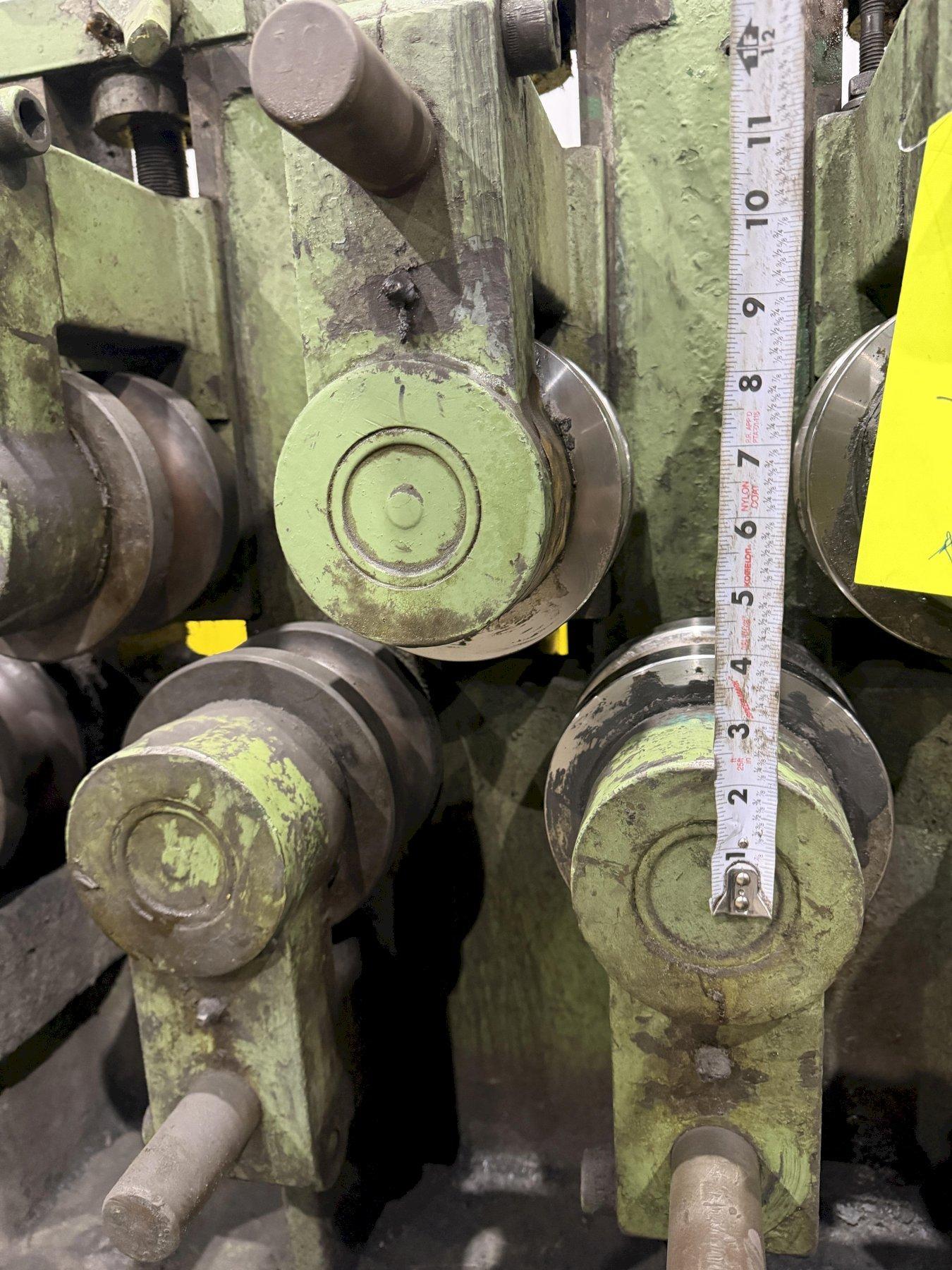 BARS ROUNDS AND HEXAGONS CAPACITIES ... 5/8" to 1-1/2" NUMBER OF ROLLS ....................... 24 NUMBER OF POWERED ROLLS ............... 12 (FIRST 6 AND LAST 6) ROLL SPEED ............................ 300FPM SHAFT DIAMETER ........................ 6" DISTANCE BETWEEN ROLL CENTERS ......... 9-1/2" CONTROL ............................... FOOT PEDAL ACTIVATION SWITCH OVERALL DIMENSIONS .................... 14'L x 7'W x 60"H VARIABLE SPEED DRIVE .................. YES DRIVE MOTOR ........................... 30 HP 2 SETS OF TOOLING - 1.5" & 2" TUBE. |