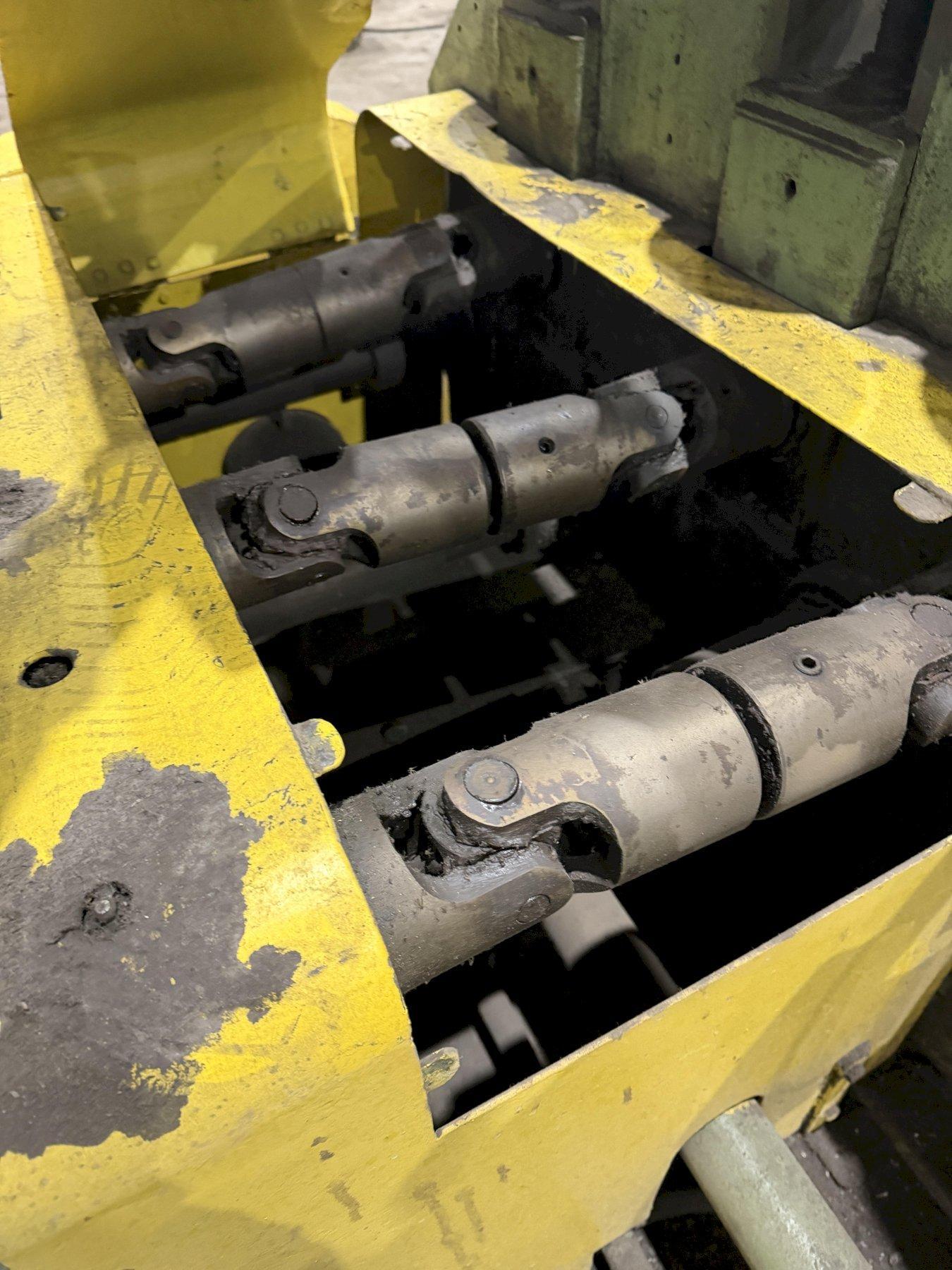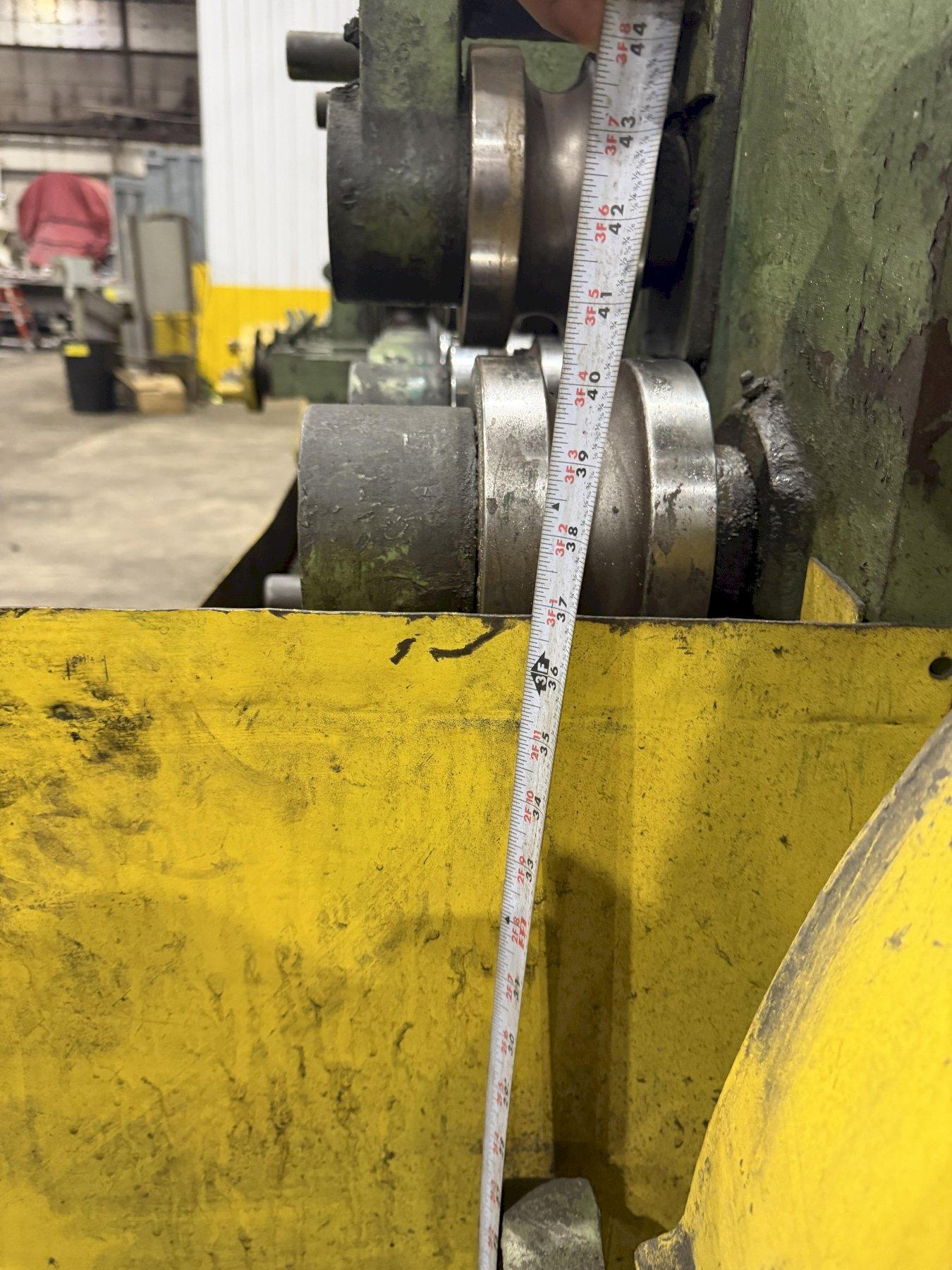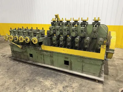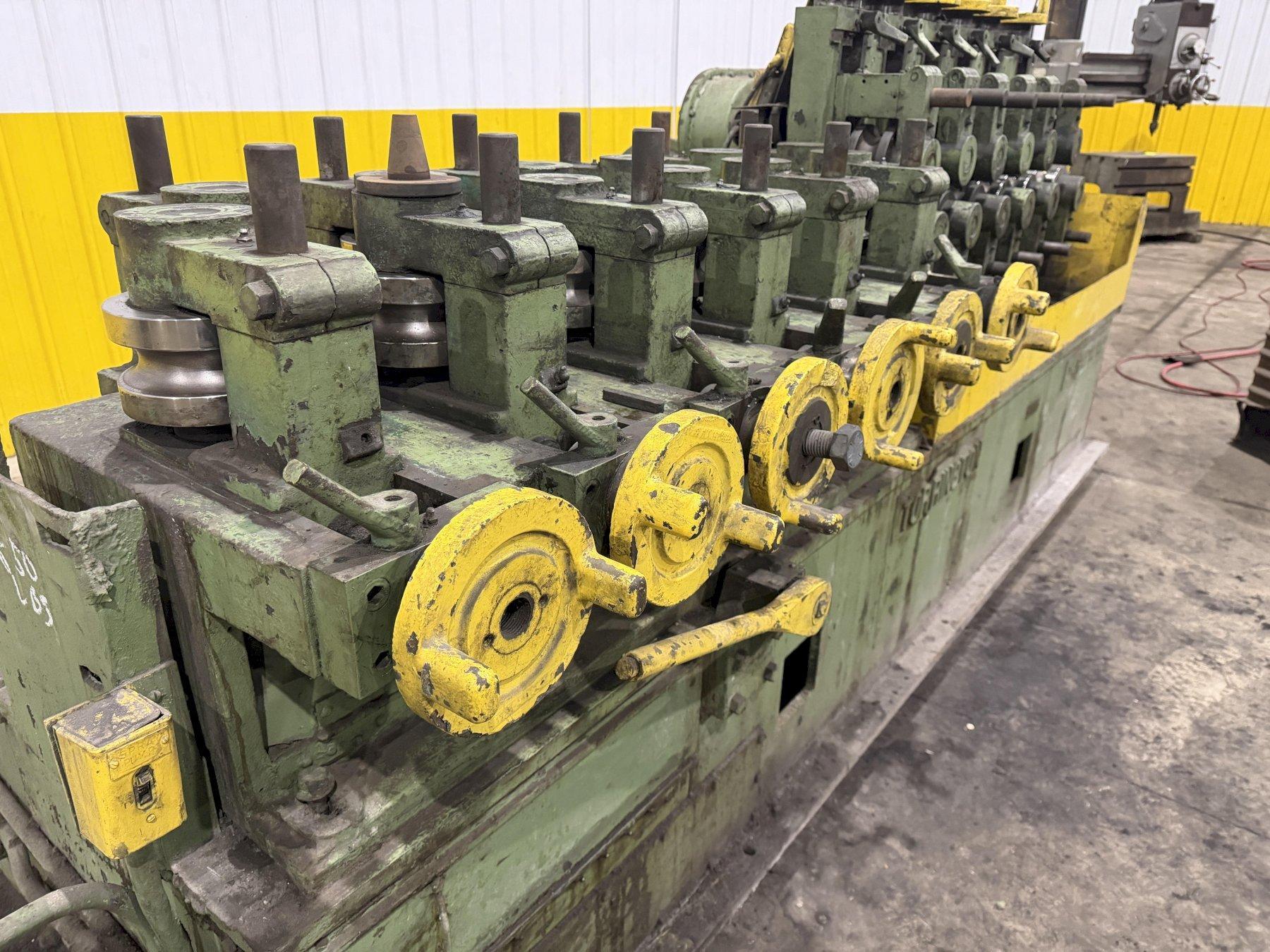 BARS ROUNDS AND HEXAGONS CAPACITIES ... 5/8" to 1-1/2" NUMBER OF ROLLS ....................... 24 NUMBER OF POWERED ROLLS ............... 12 (FIRST 6 AND LAST 6) ROLL SPEED ............................ 300FPM SHAFT DIAMETER ........................ 6" DISTANCE BETWEEN ROLL CENTERS ......... 9-1/2" CONTROL ............................... FOOT PEDAL ACTIVATION SWITCH OVERALL DIMENSIONS .................... 14'L x 7'W x 60"H VARIABLE SPEED DRIVE .................. YES DRIVE MOTOR ........................... 30 HP 2 SETS OF TOOLING - 1.5" & 2" TUBE. |