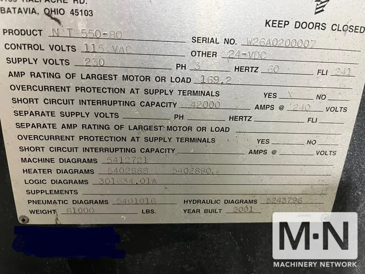 OverviewDescription550 TON 72 OZ CINCINNATI MODEL NT550-80 POWERLINE ELECTRIC INJECTION MOLDING MACHINE M,FG 2001 EXTREEM ST CONTROL
