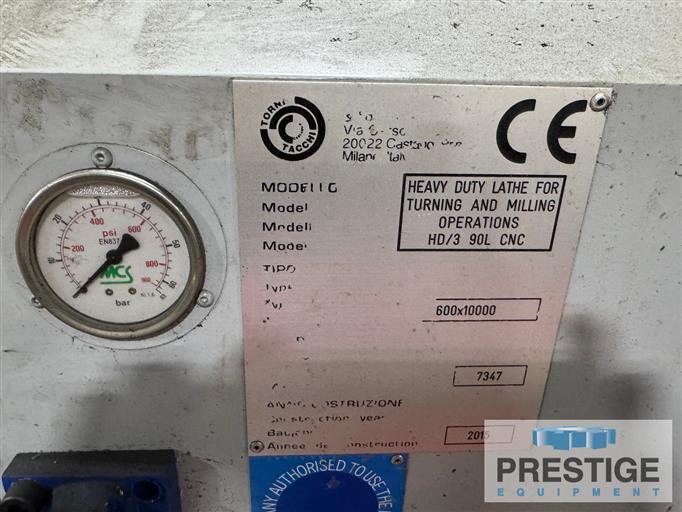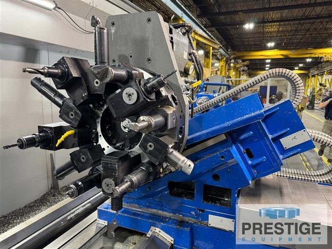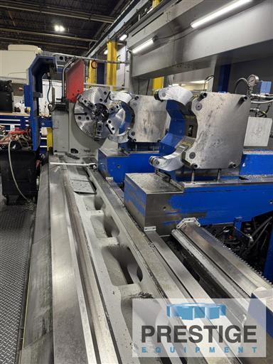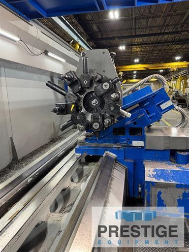 Maximum Swing Over Bed Without Covers 45.27" Maximum Swing Over Saddle 29.52" Center Height 23.62" Distance Between Centers 393.70" Weight Between Centers, Unsupported 19,800 Lbs HEADSTOCK: Speed Range, Standard 3-1000 RPM Speed Range, Constant Power 37-1000 RPM Number of Speed Ranges 3 Maximum Torque on Spindle Axis 9,000 Nm Main Headstock Drive Motor 67 HP Spindle Nose, DIN 55026 11" Spindle Hole Diameter 4.13" FEEDS: Longitudinal Feed Rate Range,Inf Variable(Z).... 0-236.22 IPM 0-236.22 IPM Cross Feed Rate Range, Inf. Variable(X)......... 0-236.22 IPM 0-236.22 IPM RAPID TRAVERSE: Longitudinal(Z) 236.22 IPM Cross(X) 236.22 IPM MILLING: Live Spindle Speeds To 3000 RPM Live Spindle Motor 20 HP TAILSTOCK: Quill Diameter 7.28" Quill Stroke 11.81" Taper of Center Morse #6 Equipped With: SIEMENS 840 DE SL Solution Line CNC Control Remote Handwheel Baruffaldi TBMA 302/12 12-Station Disc Turret w/Live Milling Heidenhain Scales on X & Z Axes 3-Morari Programable Self Centering Steady Rests w/Longitudinal Positioning Manual 3-Point Roller Type Steady Rest 24.8" & 12.4" Rohm Chucks Renishaw Tool Probe, TS13, RMP60 Carriage Can Pass Steady Rests and Tailstock Tailstock Quill Thrust Compensation Coolant System for Turning & Milling Operations Telescoping Steel Way Covers Full Length Chip Conveyor Automatic Lubrication System 460 Volt 3-Phase 60 HZ Electrics NOTE: Heavy Duty Lathe For Turning and Milling Operations. Inspect Under Power |