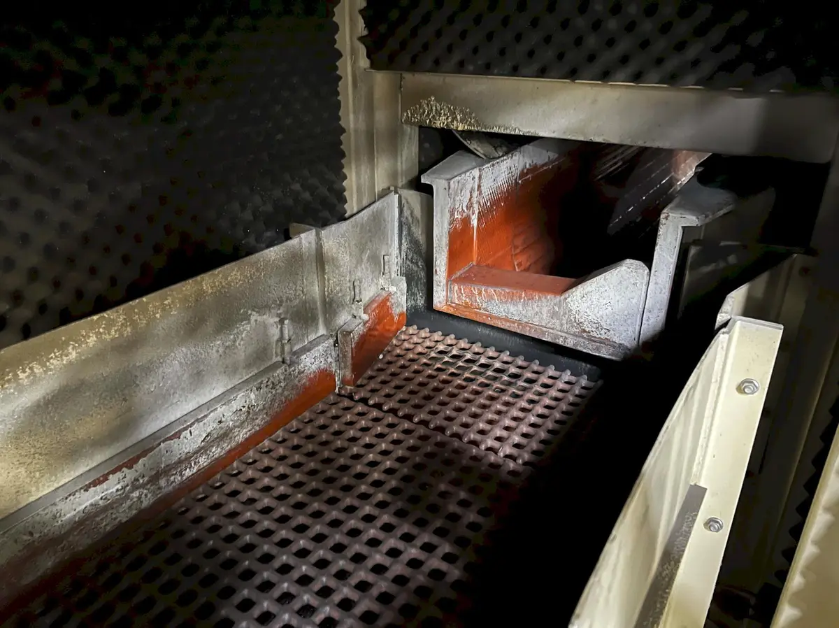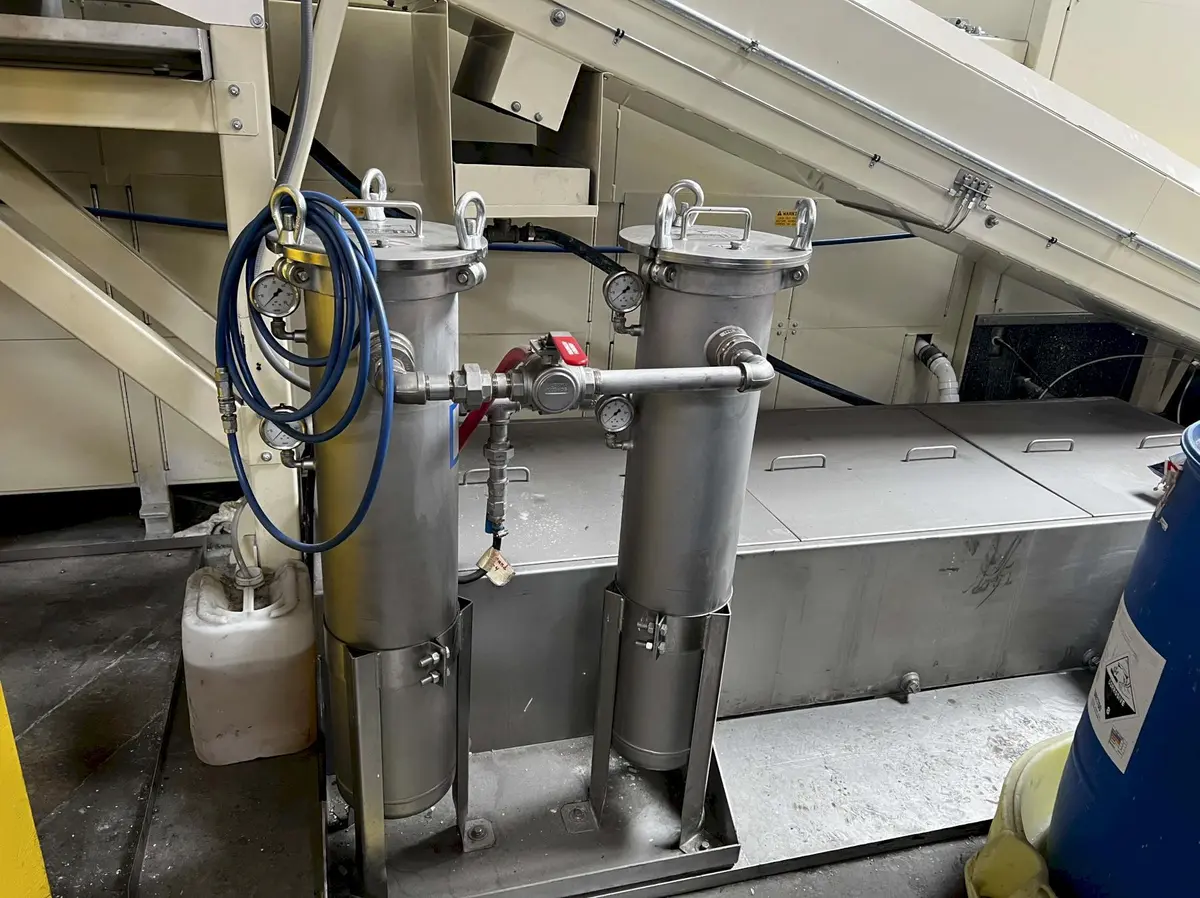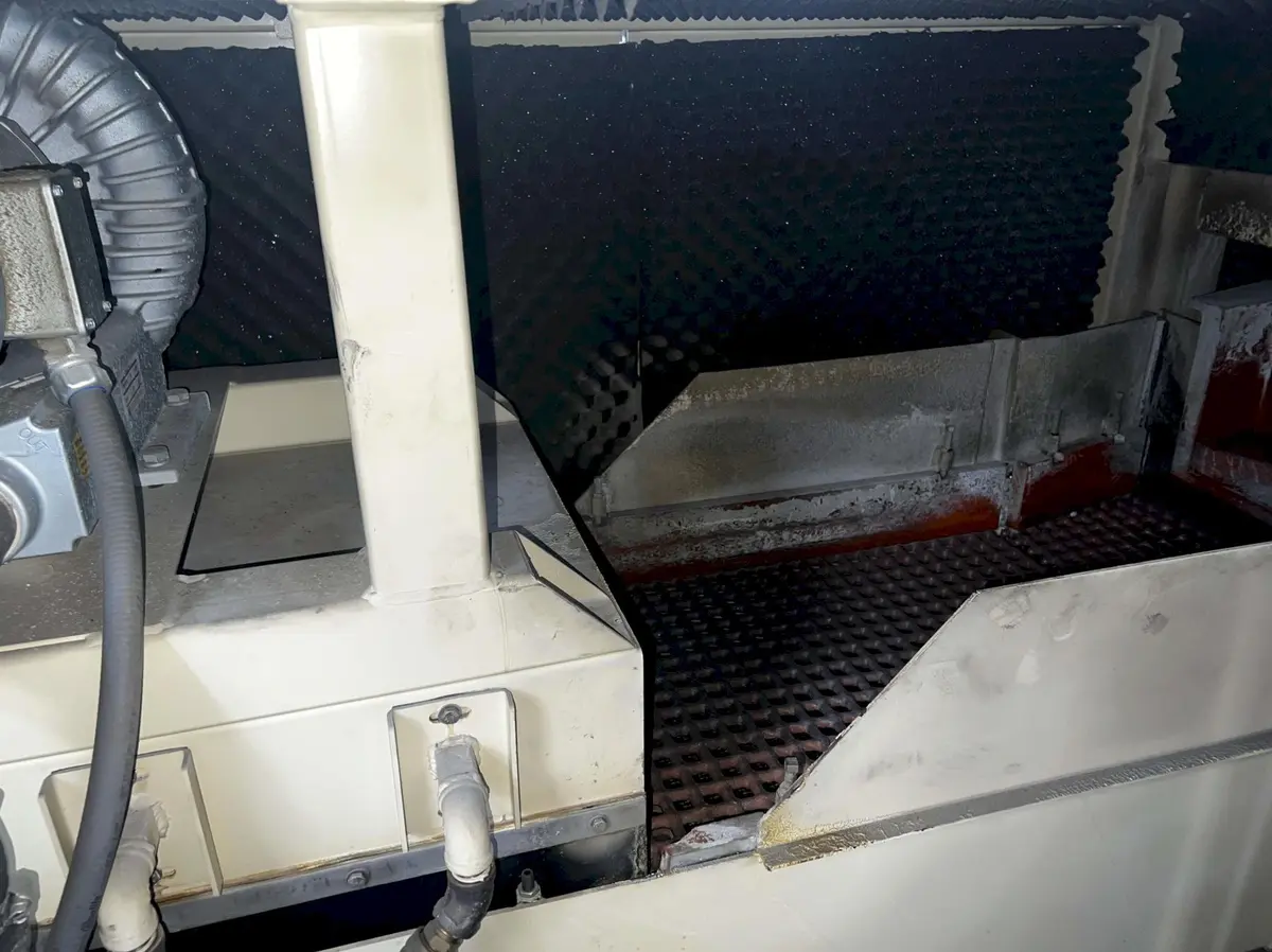 OverviewDescription2022 ALMCO V-14120 Vibratory Machine, used. Tub capacity 13.8 cu. ft., 10 HP tub motor, 35.1 amp draw, touchscreen HMI, sound enclosure, auto lubrication, spray rinse. Includes stainless tanks, heated air blow-off, and adjustable separator panels. Brand: Almco
