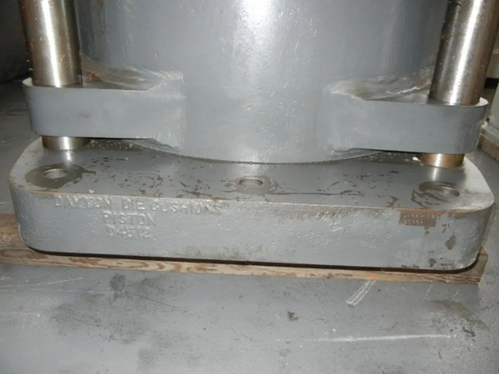 The Dayton Heavy Duty Pneumatic Die Cushion is built to withstand extremely long, heavy duty stamping and forming operations such as compound blanking, piercing and drawing. It is particularly suitable for use with medium to larger presses and can be fitted singularly or in batteries for larger beds. Excellent internal or "self-guiding" is accomplished by extra overlap between the cylinder and piston, even at the top of the stroke. It is also collapsible whenever a cushion is not needed. Highlights: