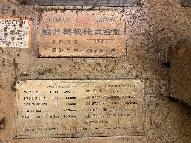 OverviewDescriptionFUKUI TTD1100T2 straight side press from 1990, offering 1,100 tons of power. Features include air brake, clutch, counterbalance, and more. Bed size 157.48"x43.3", stroke length 11.81", and motor 200 HP. Brand: Fukui