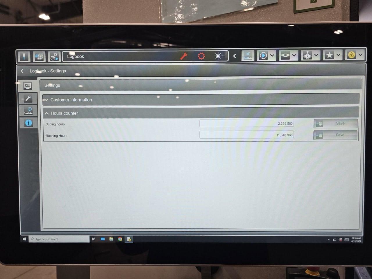 All specifications are assumed to be correct but must be confirmed by the purchasing entity.,Length, approx. 559 in Width, approx. 248 in Height, approx. 126 in Nominal sheet size (X) 160 in Nominal sheet size (Y) 80 in Cutting area (X) 162 in Cutting area (Y) 83 in Cutting area (Z) 4 in Max. positioning speed parallel axis X/Y 4724 in/min Max. positioning speed simultaneous 6681 in/min Bilateral repeatability of positioning of one axis R (following ISO 230-2:2014) All specifications are assumed to be correct but must be confirmed by the purchasing entity.,0.001 in All specifications are assumed to be correct but must be confirmed by the purchasing entity.,Average bilateral position deviation of one axis M (following ISO 230-2:2014) All specifications are assumed to be correct but must be confirmed by the purchasing entity.,0.002 in Edge detection accuracy ± 0.02 in Max. workpiece weight 4190 lbs Max. allowed workpiece weight on both shuttle tables 7080 lbs Machine weight (excl. exhaust and conveyor) 32,000 lbs Table change time 28 s Laser source Fiber 15000 Power 15000 W Range of adjustment 400-15000 W Wavelength Fiber Steel (max. cuttable sheet thickness) – /* advanced applications 1/1.96* in Steel (with BeamShaper option) 1.18 in Stainless steel (max. cuttable sheet thickness) – /* advanced applications All specifications are assumed to be correct but must be confirmed by the purchasing entity.,1.57/1.96* in All specifications are assumed to be correct but must be confirmed by the purchasing entity.,Aluminum (max. cuttable sheet thickness) – /* advanced applications All specifications are assumed to be correct but must be confirmed by the purchasing entity.,1.57/1.96* in Brass (maax. cuttable sheet thickness) 0.75 in Copper (max. cuttable sheet thickness) 0.75 in Total electric consumption of system (incl. exhaust, chiller) * 27 kW All specifications are assumed to be correct but must be confirmed by the purchasing entity. |