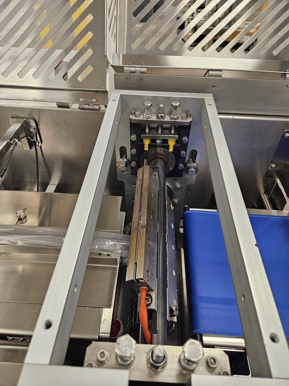 All specifications are assumed to be correct but must be confirmed by the purchasing entity.,– Standard Infeed (loading area): lugged infeed conveyor in stainless steel – Eye mark reader for printed films – No product, no bag function – Longitudinal sealing station with 3 pairs (C-H-F) of rollers for dragging, sealing, and edge-folding – Rotary motion system with 1 pair of jaws (250mm L, Centrax 140mm) for transversal sealing and cutting – Motorized product discharge through 900 mm flat belt conveyor – PLC by CMZ with 7 colored touch-screen display – Motorization with 3-axis stepless Toshiba (infeed, sealing rollers, jaws) + 2 asynchronous motors (film unwinding, out-feed belt) – Adjustable film folding box, maximum product width: 185mm – Film reel holder: top position – Maximum film reel width: 600mm – Maximum film reel weight: 40 kg – Sealing rollers: bottom position – Sealing roller layout: 3 Pairs C-H-F – Sealing and cutting jaws: rotary system – Maximum jaws length: 350mm – Maximum product height: 85mm – Standard outfeed conveyor length: 900mm – Maximum film speed: 40 m/min – Maximum packaging output: 250 PPM – Standard motorization – 230V, 60Hz, 3/PE, Max 25A All specifications are assumed to be correct but must be confirmed by the purchasing entity.,Approximately 10K in spare parts included: – Two sets of knives: a standard serrated style and a V notch – (3) REE-5003058 Heating Elements – (3) REE-X10010680 Heating Elements – (3) REE-5029008 Thermocouple – (2) REE-X20000270 All specifications are assumed to be correct but must be confirmed by the purchasing entity. |