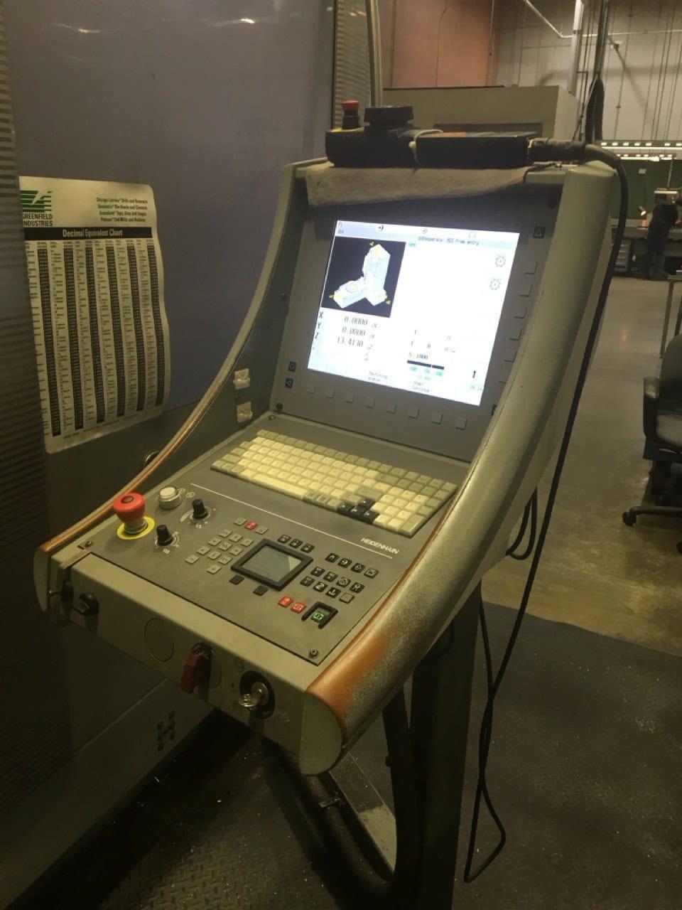 All specifications are assumed to be correct but must be confirmed by the purchasing entity.,Width: 248.03″ Depth: 255.91″ Height: 106.30″ Machine Weight: 23,589.4 lbs All specifications are assumed to be correct but must be confirmed by the purchasing entity.,Control Unit: All specifications are assumed to be correct but must be confirmed by the purchasing entity.,Model: TNC 426 Brand: HEIDENHAIN All specifications are assumed to be correct but must be confirmed by the purchasing entity.,Main Drive: All specifications are assumed to be correct but must be confirmed by the purchasing entity.,Spindle Speed Range: 12,000 RPM Tool Taper: SK 40 Number of Axis: 5 All specifications are assumed to be correct but must be confirmed by the purchasing entity.,Movement: All specifications are assumed to be correct but must be confirmed by the purchasing entity.,X-Axis: 23.62″ Y-Axis: 27.56″ Z-Axis: 23.62″ All specifications are assumed to be correct but must be confirmed by the purchasing entity.,Technical Machine Benefits: All specifications are assumed to be correct but must be confirmed by the purchasing entity.,Feed Rate: 5905.51″/min Rapid Traverse: 1968.50″/min Clamping System: DIN 69872 Tool Changer: 30 Places Type: Horizontal Magazine All specifications are assumed to be correct but must be confirmed by the purchasing entity.,Automatic Swivelling Milling Head Automatic Change from Vertical to Horizontal Machining Main Drive Type: AC Drive Power (100% ED): 19 kW All specifications are assumed to be correct but must be confirmed by the purchasing entity.,Qualitative Machine Benefits: All specifications are assumed to be correct but must be confirmed by the purchasing entity.,Theoretical Pump Output: 158 gallons Scraper Flight Conveyor, Coolant Through Spindle Form Center Dead Form Tilting NC Rotary Table: 24.80″ Type of Measurement System: Direct Measurement System Table Surface: 24.80″ Center Diameter: 1.97″ Maximum Load (Table Center): 1102.31 lbs Slot Width: 0.55″ Distance Between T-Slots: 2.48″ Max. Rotational Speed 4. Axis: 7 RPM 4 Axes (Turning Radius): 360 x 0.001 degrees 5 Axes (Turning Radius): -45 / +30 x 0.001 degrees Rotational Speed of Axis 5: 7.3 RPM All specifications are assumed to be correct but must be confirmed by the purchasing entity. |