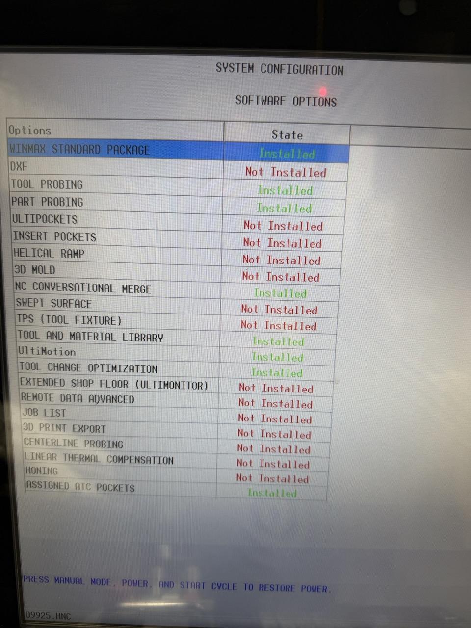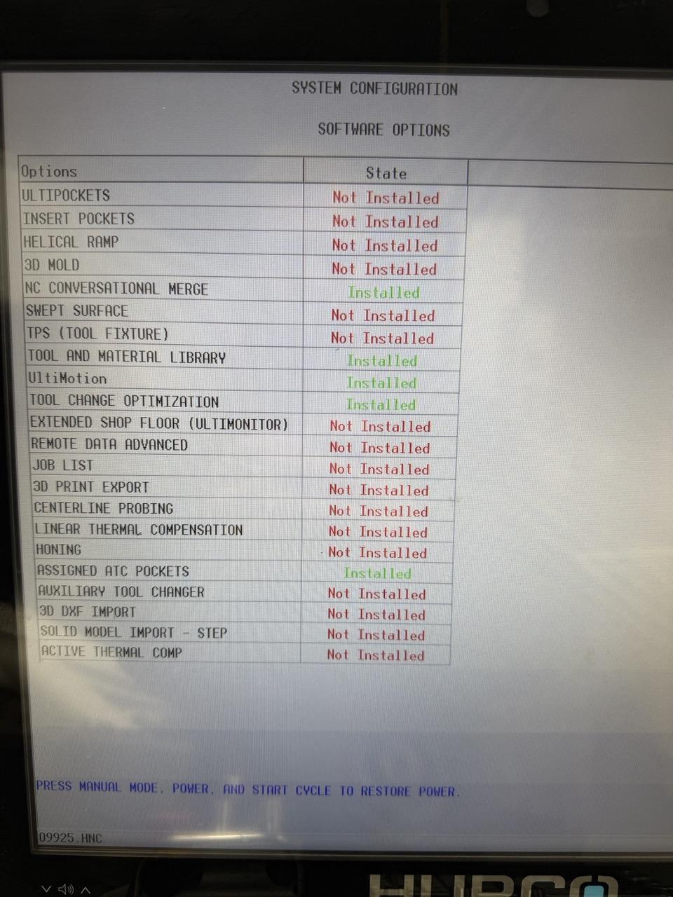 All specifications are assumed to be correct but must be confirmed by the purchasing entity.,Equipped With: WinMax Control H-200 4th Axis Rotary 4th Axis Hurco Tailstock Thru Spindle Coolant (300 psi) Chip Conveyor Winmax Standard Package Tool Probing Part Probing NC Conversational Merge Tool and Material Library UltiMotion Tool Change Optimization Assigned ATC Pockets All specifications are assumed to be correct but must be confirmed by the purchasing entity. |