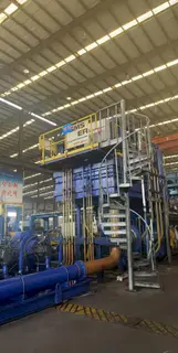 Stock #14592 1. Mechanical configuration: 1.1 Nominal total extrusion force of the equipment is 3500T 1.2 Aluminum rod specification φ305x1300 1.3 Holding ingot cylinder φ315x1350 1.7 Discharge size φ350x450 2. Hydraulic system 2.1 High pressure piston pump A4VS0 355 EO2 2.2 Auxiliary oil pump A4VS071DR 3. Electrical system 3.1 Main oil pump motor ABB 4 stage 200 KW 3.2 Auxiliary oil pump motor ABB 55 KW 3.3 PLC Siemens S400 3.4 HMI Siemens 4 Cooling system Plate cooling 2. Auxiliary equipment (4000T support) 1 Aluminum rod heating furnace 2 Mold heating furnace 3 Discharge water quenching 4 Puller 5 Cold bed 6 Straightener 250T 7 Finish saw 9 Mold base φ540x520 **Temporary Specifications Subject to Revisions** **PRICE QUOTED AS IS WHERE IS SUBJECT TO PRIOR SALE** **ALL SPECIFICATIONS ARE SUBJECT TO VERIFICATION** |
