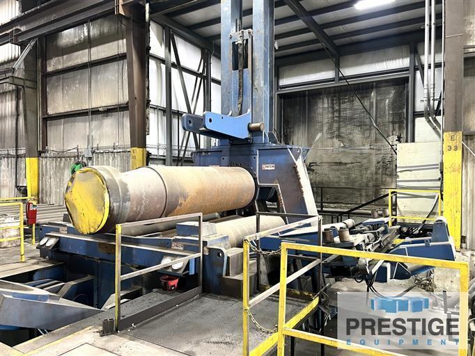 Max. Plate Length 120" Number Of Rolls 4 Top Roll Diameter 41.33" Lower Roll Diameter 37.40" Side Rolls Diameter 30.70" CAPACITY:FULL LENGTH @ 260 N/mm2, 206" ID: Max. Bending Thickness 6.29" Max. Prebend Thickness 5.51" FULL LENGTH @ 260 N/mm2, 53" ID: Max. Bending Thickness 5.51" Max. Prebend Thickness 5.11" FULL LENGTH @ 360 N/mm2, 206" ID: Max. Bending Thickness 5.43" Max. Prebend Thickness 4.72" FULL LENGTH @ 360 N/mm2, 53" ID: Max. Bending Thickness 4.72" Max. Prebend Thickness 4.40" HALF LENGTH @ 360 N/mm2, 206" ID: Max. Bending Thickness 7.87" Max. Prebend Thickness 6.88" Equipped With: Faccin PGS-Classic NC Control 4-Rolls Design Electronic Roll Balancing Electronic Conical Bending from Mobile Console Interchangeable 30.79" Top Roll Hydraulic Drop End Overhead Plate Support Side Support Feed Table |