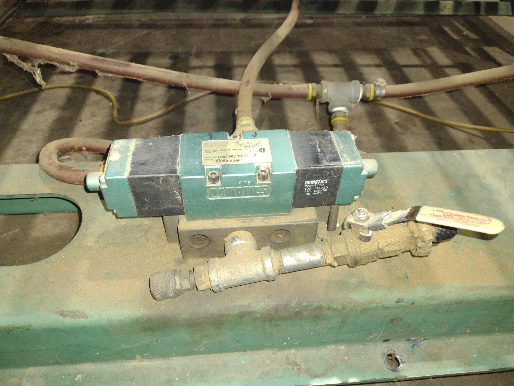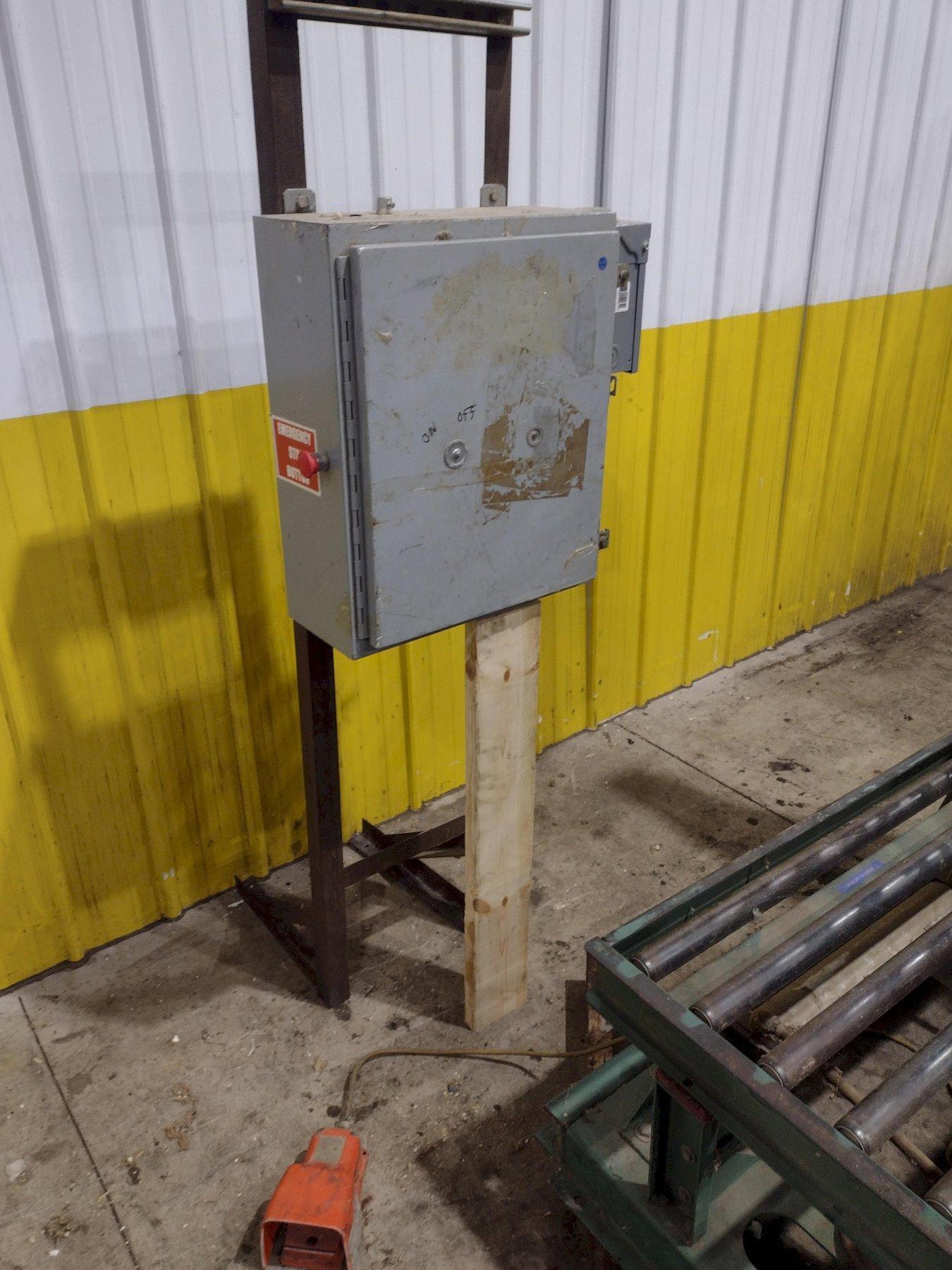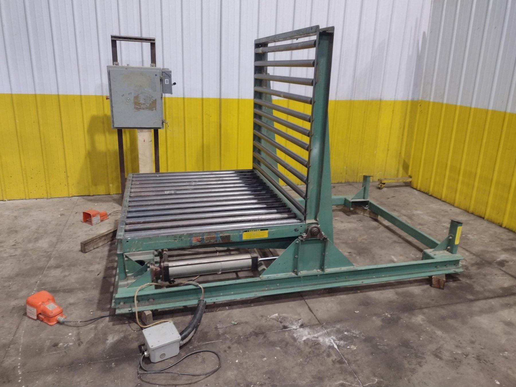 90 Degree gravity roller conveyor table Dual pneumatic table tilting cylinders Foot pedal tilting controls Accordion type dust and safety guard 115 volt single phase, 60 hz Vertical table size 22-1/2" wide x 60" long 20-1/2" long steel rollers, 2-1/2" diameter mounted on 4-1/2" centers Horizontal table size 48-1/2" wide x 60" long 46-1/2" long steel rollers, 1-7/8" diameter mounted on 4-1/2" centers Horizontal/vertical table height 24" |