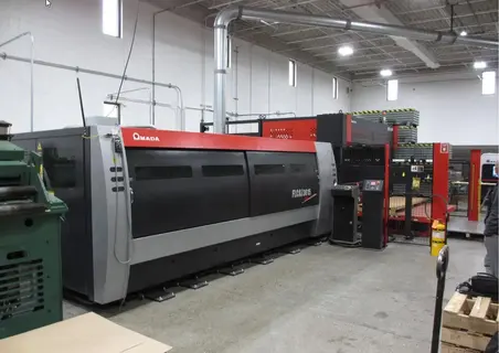 Amada FLC 3015 AJ 2000 watt, 5’ X 10’ fiber laser cutting system, is a high-production laser cutting system. The MPL 3015 F1 load \ unload system gives you the ability to cut lights out without tabbing nested parts for little or no secondary processing.
