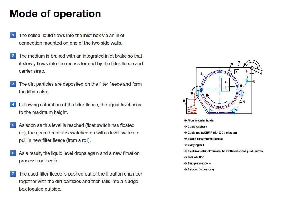 Compact belt filter type AKBF-RApplications:This system is successfully used to clean cooling lubricants, such as emulsions or low-viscosity machining oils in the metal-working industry.The advantage of the filter lies in its completely automatic, continuous mode of operation. |