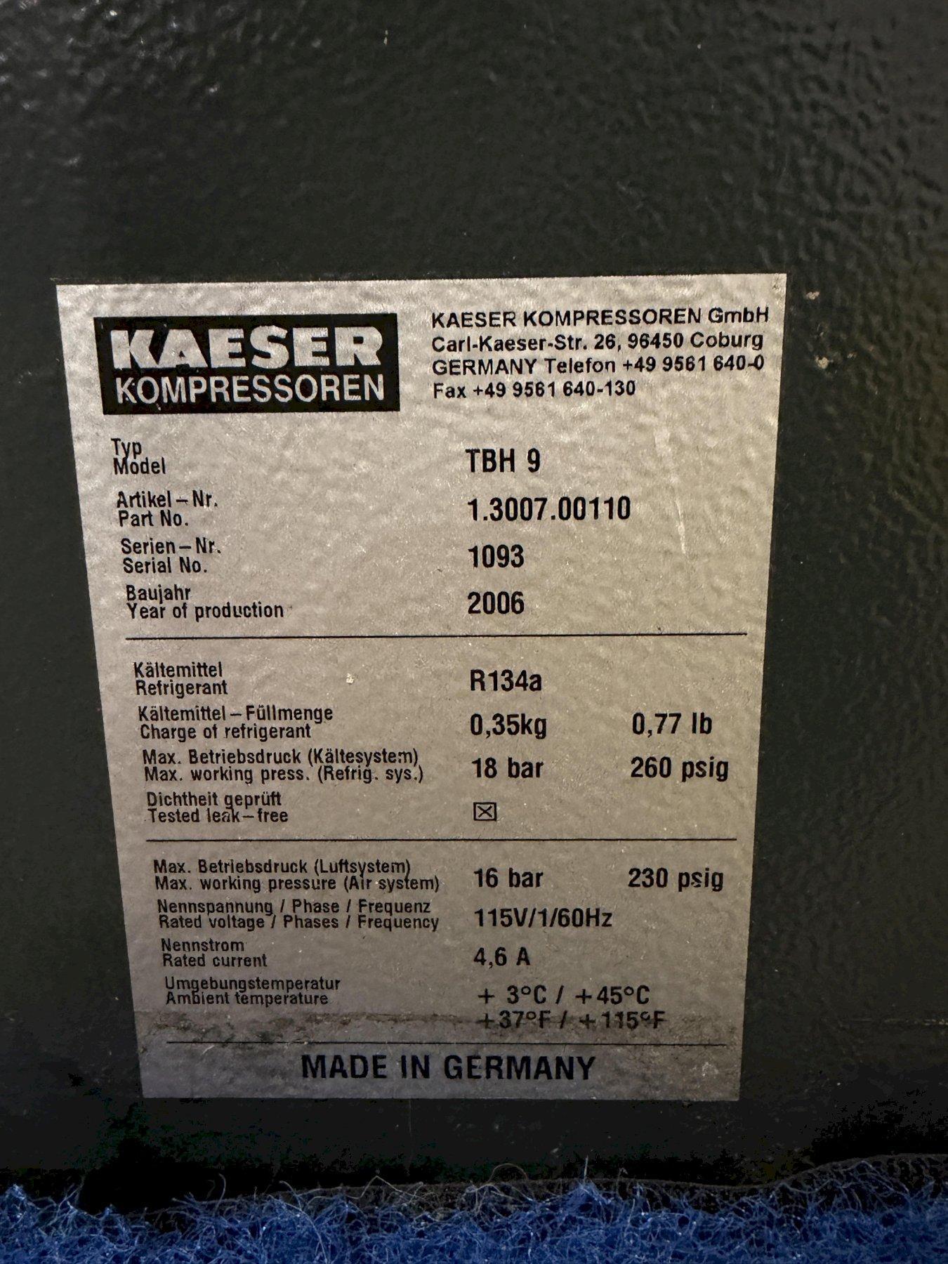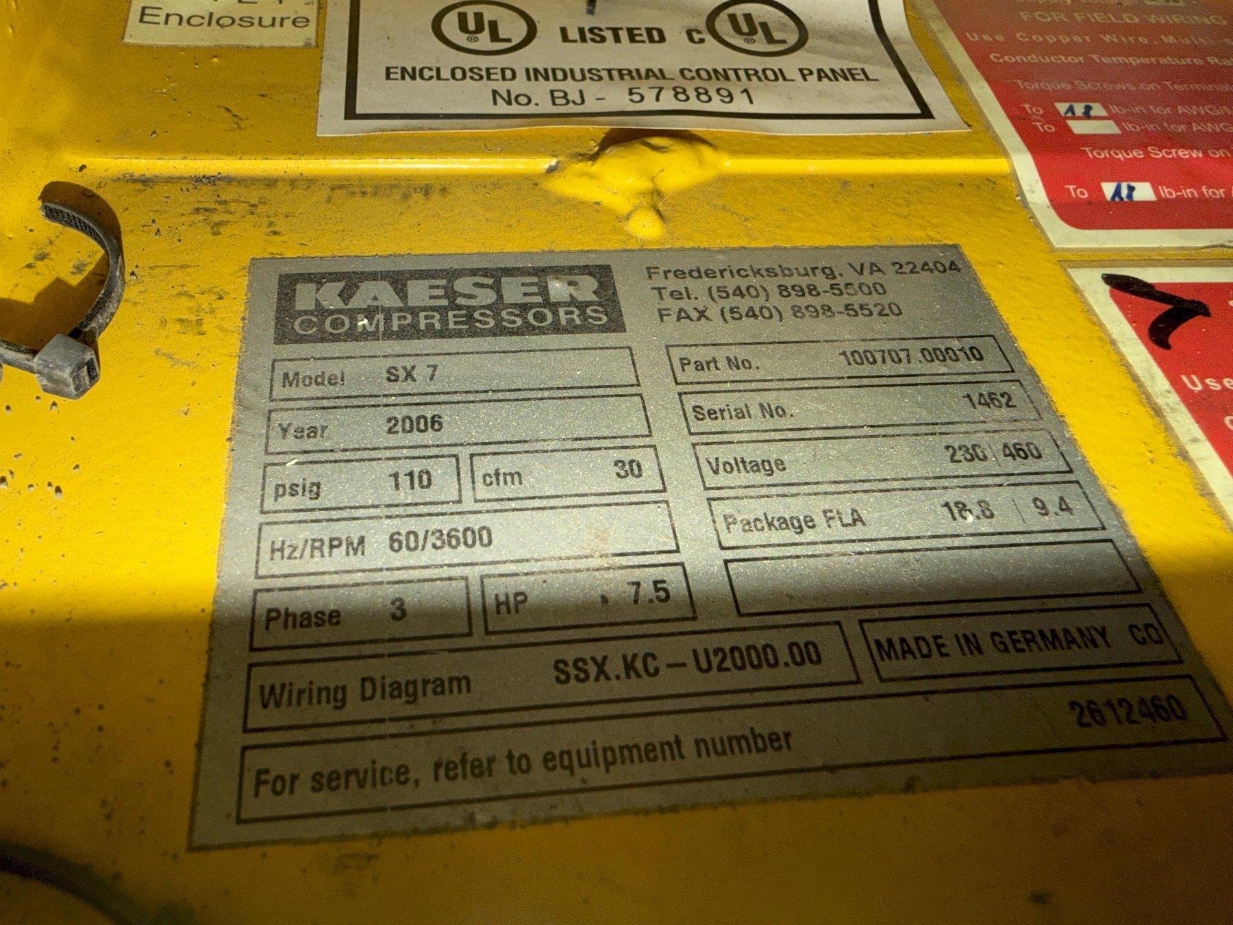 NEW 2006 PART 100707.00010 MODEL SX7 MOTOR 7.5 HP PRESSURE 110 PSIG DRYER SERIAL 1093 NEW 2006 PART 1.3007.00110 MODEL TBH9 TANK SERIAL 495326 NEW 2006 CAPACITY 200 PSI |