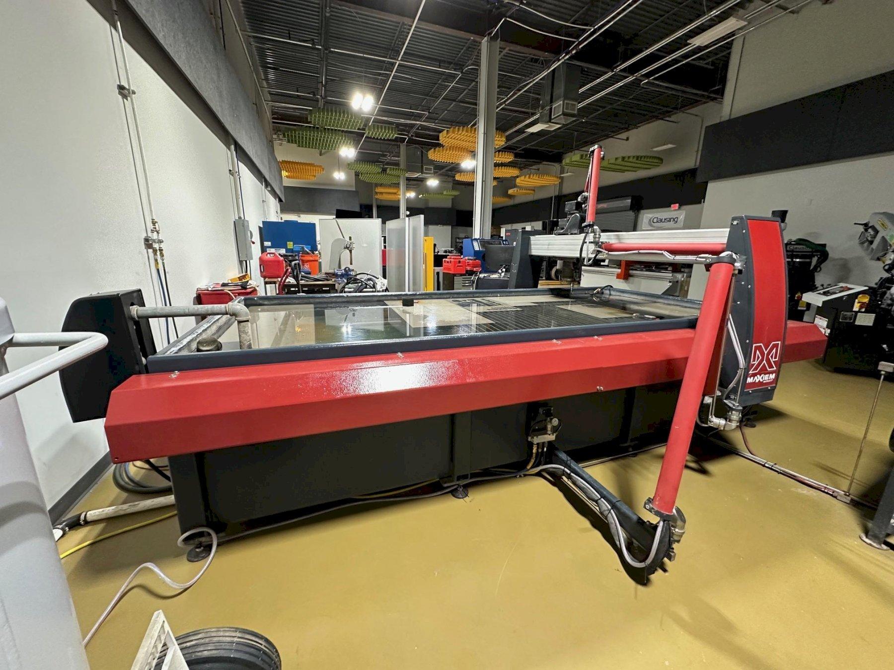 Used Maxiem Model 1530 5’ x 10’ Abrasive Waterjet Cutter Manufactured 2018, Approximately 1,800 Hours Table Size: 146” x 68” Cutting Capacity: 120” x 62” Parking Area for Carriage for Loading: 29” Z-Axis Travel 12” Programmable Table Support Load 300 Lbs Sqr/Ft Material Support Slats: 4” x 14 Ga. Galvanized Steel (34) Rapid Traverse Speed: 500” IPM Drive System: Closed Loop Linear Drive System w/ 1 Micron Resolution Direct Drive Pump Horsepower: 30 HP Pump Pressure: 50,000 PSI Nozzle Configuration: 0.014” Orifice, 0.030”/4” Mixing Tube Garnet Feed System: Gravity Feed 15 lbs. Hopper Computer: PC Based w/ Wide Screen Monitor, Keyboard, Mouse Software: Omax Intelli-Max Basic Control Software Footprint: 169”L x 130”W x 126” H (Without Controller) Operating Weight: 15,700 Lbs. Control · Windows PC Based Controller · Wide Screen Monitor · Mobile Control Station, E-Stop, & Pause Button · Network Compatible · Hub Control for Ease at Adding Future Accessories · USB Ports for Quick File Loading/Backup