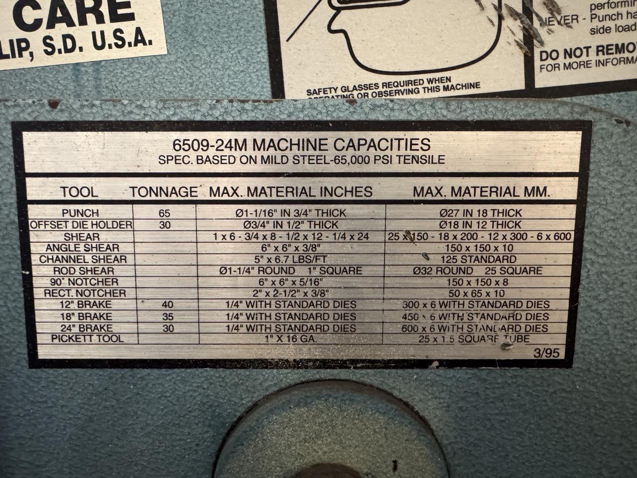 All specifications are assumed to be correct but must be confirmed by the purchasing entity.,Strokes Per Minute in Light Material: 1/4″ Stroke [Punch Station] Strokes Per Minute in Heavy Material: 3/4″ Stroke [Punch Station] All specifications are assumed to be correct but must be confirmed by the purchasing entity.,Power: 5 HP Motor, 230V/3 Phase (standard) Hydraulics: 2,600 PSI Shipping Weight: 3,000 LBS All specifications are assumed to be correct but must be confirmed by the purchasing entity. |