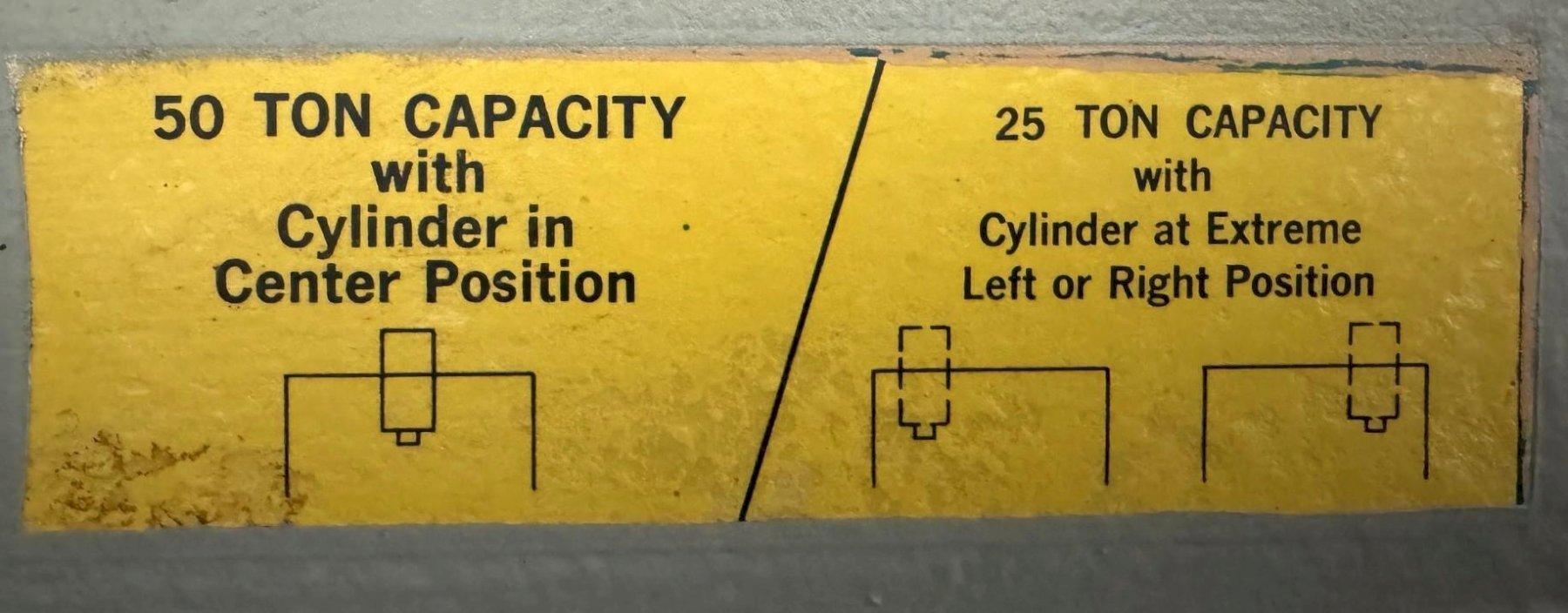 MODEL: PER3042 SERIAL NUMBER: BE2292 GENERAL SPECIFICATIONS Capacity, Center Position: 50 Tons Capacity, Left and Right Positions: 25 Tons Stroke: 13" Diameter Of Ram: 3" Width Between Uprights: 28-3/4" Bed Width: 13" Bed Height: 12" Number Of Table Height Adjustments: 6 Vertical Centers Of Bed Adjustments: 7" EQUIPPED WITH 1-1/2 HP Hydraulic Pump Motor, 120/60/1 Hydraulic Bed Lift (2) Table Plates Approximate Weight: 1500 Lbs. F.O.B. Cincinnati, Ohio ALL SPECIFICATIONS SUBJECT TO VERIFICATION BY PURCHASER |