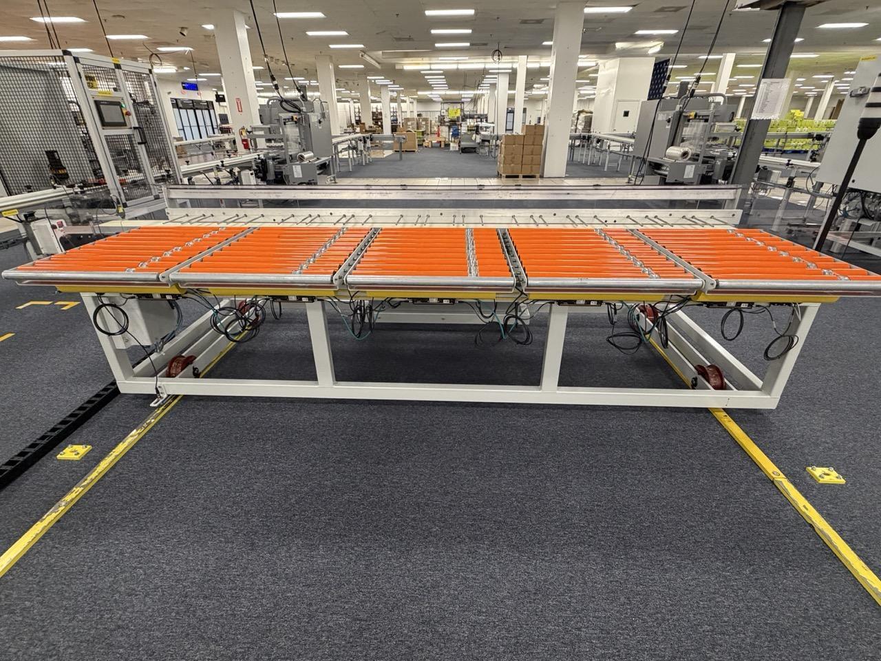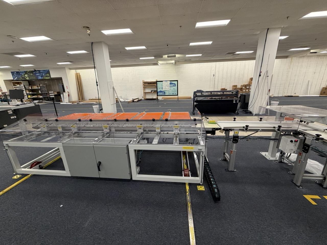 Designed to automatically transport plastic tiles from a printer, orient them, and feed two shrink wrap systems that then feed one cartoner and one case packer as a fully automated complete packaging solution; this listing combines several listings into one complete packaging solution for flat products, including Revelation Machinery Stock Numbers: