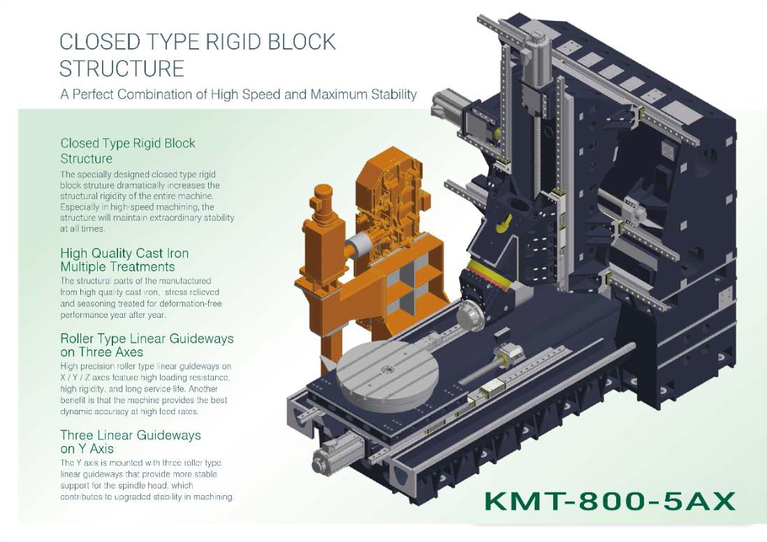The KMT-800-5AX is a high-performance 5-axis milling and turning center engineered to deliver exceptional rigidity, precision, and flexibility. Featuring a specially designed closed-type rigid block structure, this machine integrates milling and turning operations into one seamless setup—significantly reducing setup time while expanding machining capabilities beyond conventional mill-turn solutions. Built for demanding, high-speed, multi-axis applications, the KMT-800-5AX enables manufacturers to machine complex, high-precision parts with confidence and efficiency. Product Highlights