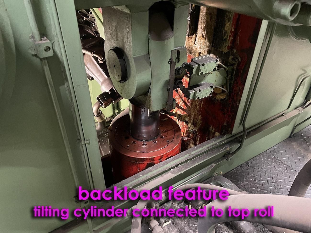Machine is equipped with backload feature > a tilting cylinder which is connected to the top roll; this allows the operator to apply upwards or downwards backload to the top roll to counter act deflection of the top roll = crowning of the top roll > incredibly rare feature!