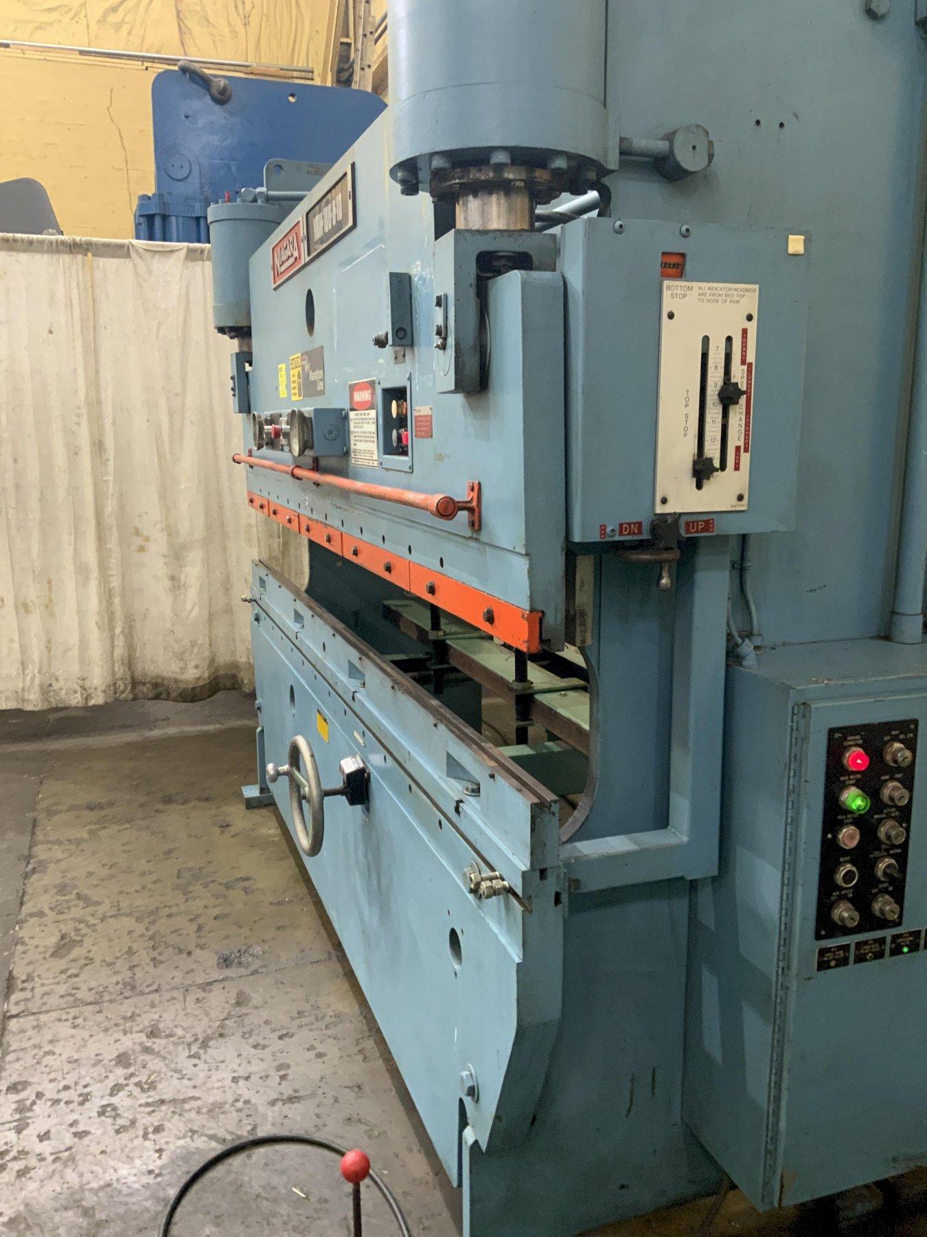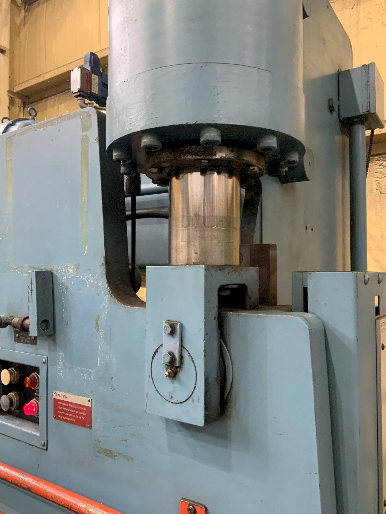 SERIAL .......................... P52216 MODEL ........................... HBM-100-8-10 YEAR NEW ........................ 1987 CAPACITY ........................ 100 TON OVERALL LENGTH OF BED ........... 10' DISTANCE BETWEEN HOUSINGS ....... 8'6" STROKE .......................... 7" OPEN HEIGHT ..................... 14" CLOSED HEIGHT ................... 7" DEPTH OF THROAT ................. 7" RAM SPEED RAPID ADVANCE ......... 127 IPM RAM SPEED NORMAL PRESS .......... 64 IPM RAM SPEED ANTI BACK BEND ........ 20 IPM RAM SPEED RETURN ................ 127 IPM DUAL PALM BUTTONS ............... YES ELECTRIC FOOT PEDAL ............. YES FILLER BLOCK .................... 2" HIGH PASS LINE HEIGHT ................ 36-1/2 BACK GAUGE ...................... MANUAL FRONT OPERATED INCHING AND SINGLE STROKE ....... YES MOTOR ........................... 20 HORSEPOWER |