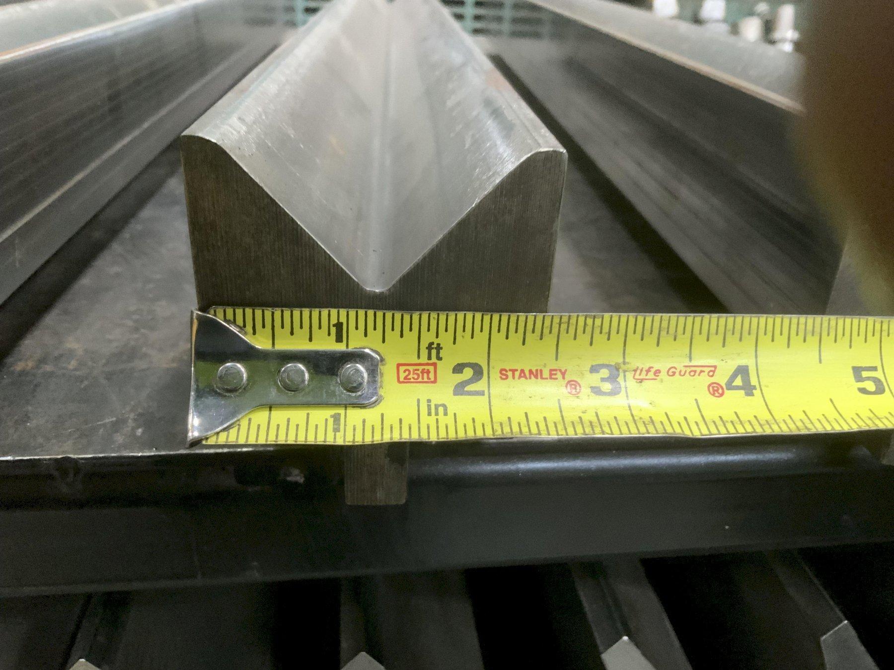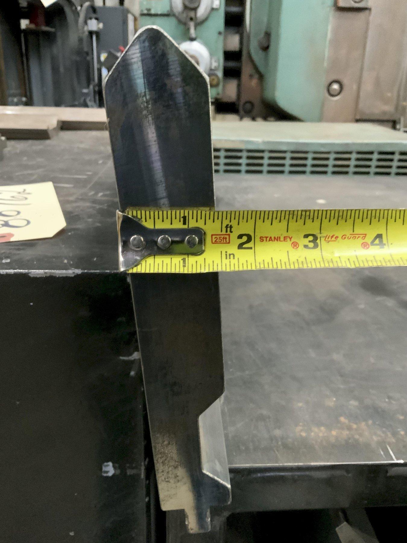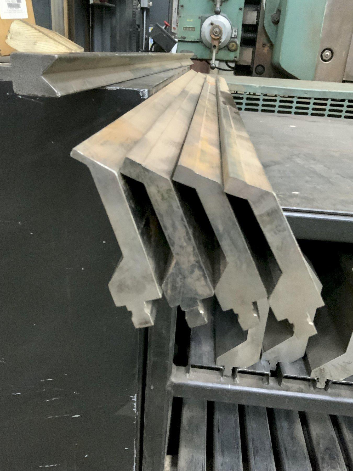 MODEL .............................. BUI-882 GOOSENECK SECTIONS ........................... 7 LENGTH PER SECTION ................. 20.5" WORKING HEIGHT ..................... 8" TIM ANGLE @ ........................ 80 DEGREES RADIUS R ........................... 1 MM CNC DEEP HARDENED .................. > 4MM/52-60HRC MAX LOAD PER FT .................... 29 TON 4 SECTION MALE WIL A DIE ........... 24",23-1/4",22-1/4" & 12-14/" HEIGHT ............................. 8-1/2" X 1-3/8" WIDE 4 SECTION OF WILA GOOSENECK ........ 48", 45",45" & 41-1/2" HEIGHT ............................. 4-1/2" 4 SECTION OF WILA FILLER BLOCK ..... 24" WIDE ............................... 1-7/8" X 2-1/2" HIGH WILA HEMMING DIE ................... 20-1/2" 4 SECTION WILA FEMALE DIE .......... 30" LONG 2-1/2: WIDE ,2" HIGH 2' OPENING 1 FEMALE DIE ....................... 48" LONG 6" WIDE 5-1/4" HIGH 5" OPENING MISCELLANEOUS ...................... DIE ACUTE GOOSENECK & V DIE |