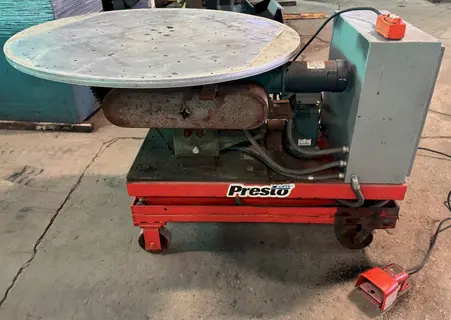 *Manufacturer unknown, no data tag. GENERAL SPECIFICATIONS Estimated Capacity: 500 Lbs. Variable Speed Table Rotation Electric: 115 Volt, 1 Phase EQUIPPED WITH 48" Diameter Aluminum Table Electric Foot Switch Operation Up/Down Tilt Buttons Mounted to 2000 Lb. Capacity Presto Hydraulic Lift Table On Casters w/Pendant Control F.O.B. Cincinnati, Ohio ALL SPECIFICATIONS SUBJECT TO VERIFICATION BY PURCHASER |