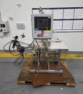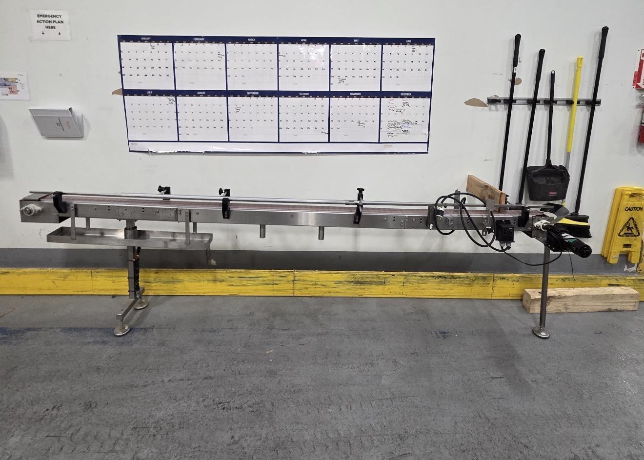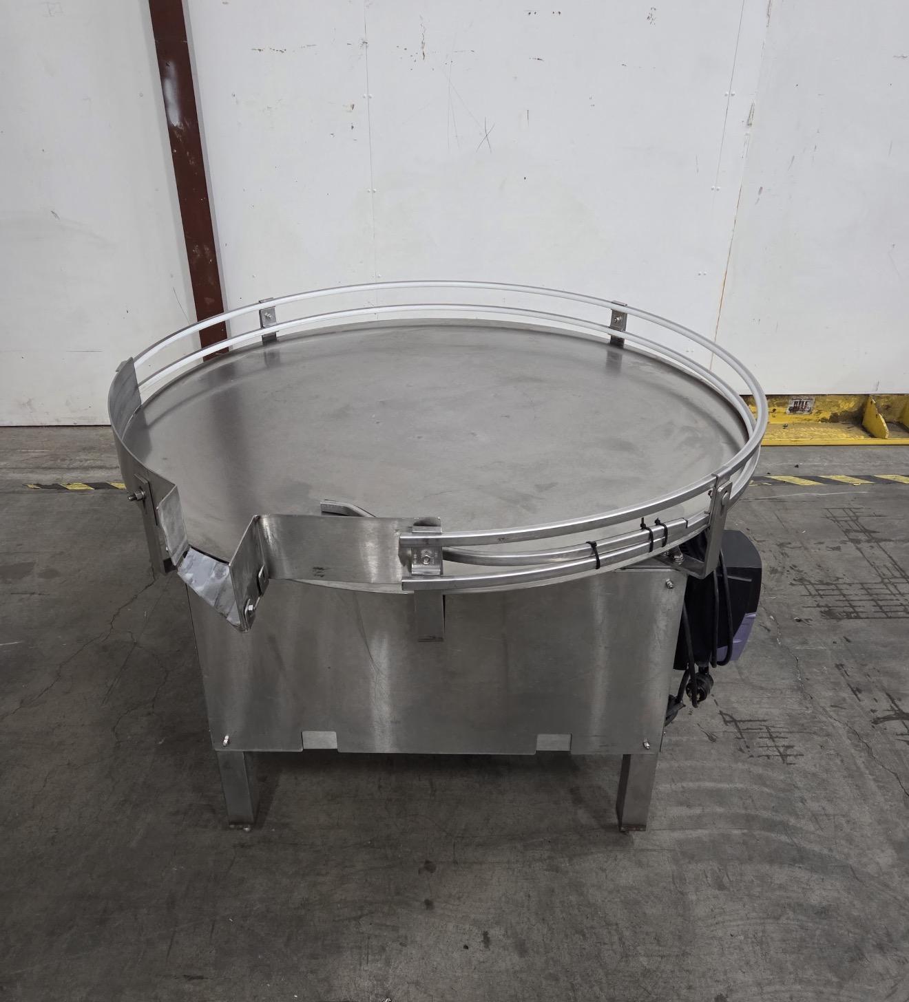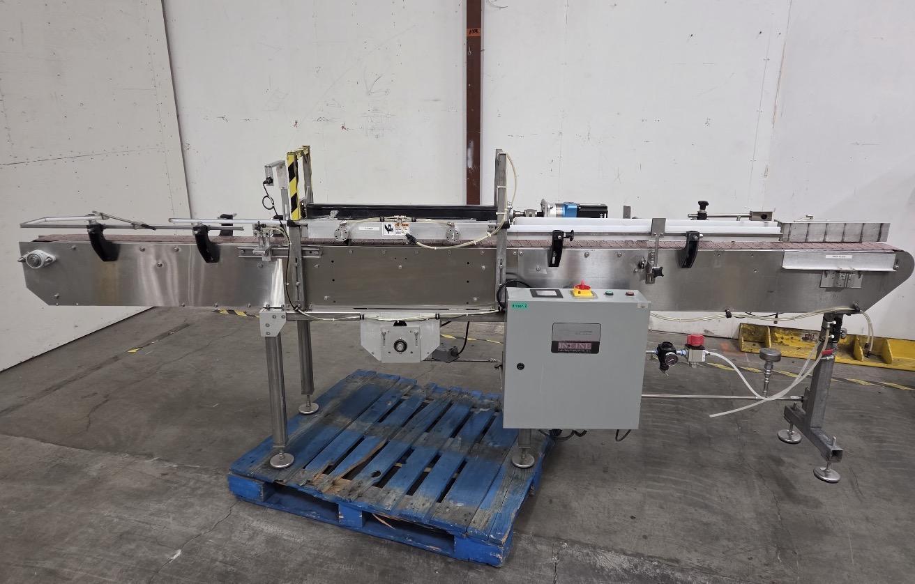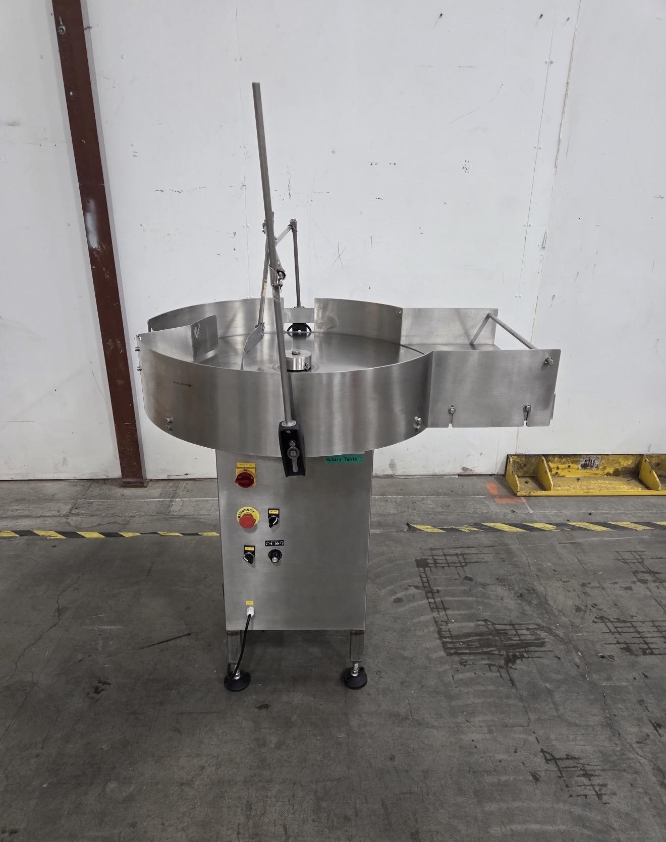 All specifications are assumed to be correct but must be confirmed by the purchasing entity.,System includes: All specifications are assumed to be correct but must be confirmed by the purchasing entity.,Excel Packaging Rotary Table, RSM-800A Rotating table for manual depalletization All specifications are assumed to be correct but must be confirmed by the purchasing entity.,In-Line Packaging Systems RSC Automatic Rinser All specifications are assumed to be correct but must be confirmed by the purchasing entity.,The Rinser is designed to take incoming containers, invert them for rinsing or air cleaning, return them upright, and continue down the production line. The machine functions in this way: – Bottles are counted as they enter the rinser area by the counting eye. When the bottles per cycle count is complete (this count is changed in the Systems settings screen) the holdback gate fires, preventing any further bottles from entering the rinser. – After the completion of the clamp delay, the bottles are clamped and held. – A pivot delay starts, and when complete, the pivot move begins to invert the bottles. – The pivot speed, pivot move length, accel and decel parameters control how the inverter mechanism inverts the bottles to position them above the rinser manifold. – After the move is complete, a water jet delay begins and when complete the water pump turns off, forcing water up through the water jets and into the bottles. – The water is on for the water jet dwell and then stops. The drain length allows the water to run out and drain from the bottles. – When that is complete, the inverter mechanism returns the bottles back to the conveyor. – A clamp release delay completes and the bottle clamp turns off. – A Front gate delay then begins. When the delay is complete, the front gate opens and allows the rinsed bottles to exit. The gate remains open the length of the front gate dwell, which should be just enough time for the containers to pass the front gate. After the dwell the gate closes to start collecting the next cycle. – The backup photoeye, if blocked for the length of the Discharge backup delay, will prevent the front gate from opening. It will remain closed until the backup eye clears at which time the entire cycle will resume. – When the front gate opens, a holdback gate retract delay begins. When complete, the holdback gate opens and allows new containers to pass the counting eye. All specifications are assumed to be correct but must be confirmed by the purchasing entity.,Meheen R-Series Bottle Filling Machine All specifications are assumed to be correct but must be confirmed by the purchasing entity.,Zalkin ROPP Capper All specifications are assumed to be correct but must be confirmed by the purchasing entity.,Inline-Packaging Equipment Paradigm 700VS Labeler: The model Paradigm 700VS is a fully automatic labeling machine capable of applying labels to cylindrical containers. – Bottle dimensions: 1 inch to 5 inches – Label height: 1 inch to 4 1/2 inches – Label Width (length): 2 inch to 12 inches long – Speed: Variable to 700 inches per minute – Maximum Rate: 60 Labels/minute – Label Gap: 1/8 inch standard (up to 1/4 inch on some) – Core size: 3 inches in diameter – Roll Size: Maximum 12 inches – Product Detection: Photoelectric eye –Background Suppression – Label Detection: Photoelectric eye – Through Beam – Power Requirements: 120 VAC, 60 hz, 3 amp – Compressed Air 3-4 cfm @ 65 psi if needed for coder All specifications are assumed to be correct but must be confirmed by the purchasing entity.,Rotary accumulation table All specifications are assumed to be correct but must be confirmed by the purchasing entity. |
