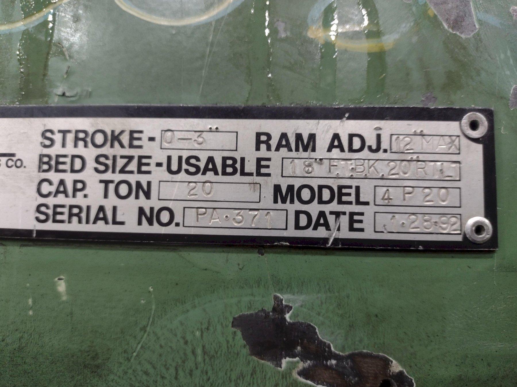 NEW .................... 11.28.1992 MODEL .................. 4P-20 CAPACITY ............... 20 TON STROKE ................. 0" TO 3" ADJUSTMENT ............. 12"" BED SIZE ............... 18" F-B X 20" L-R |