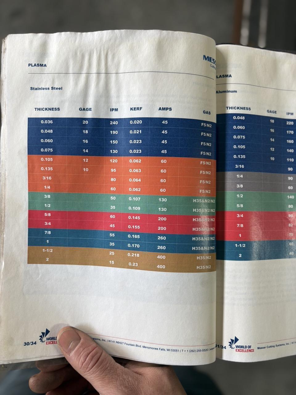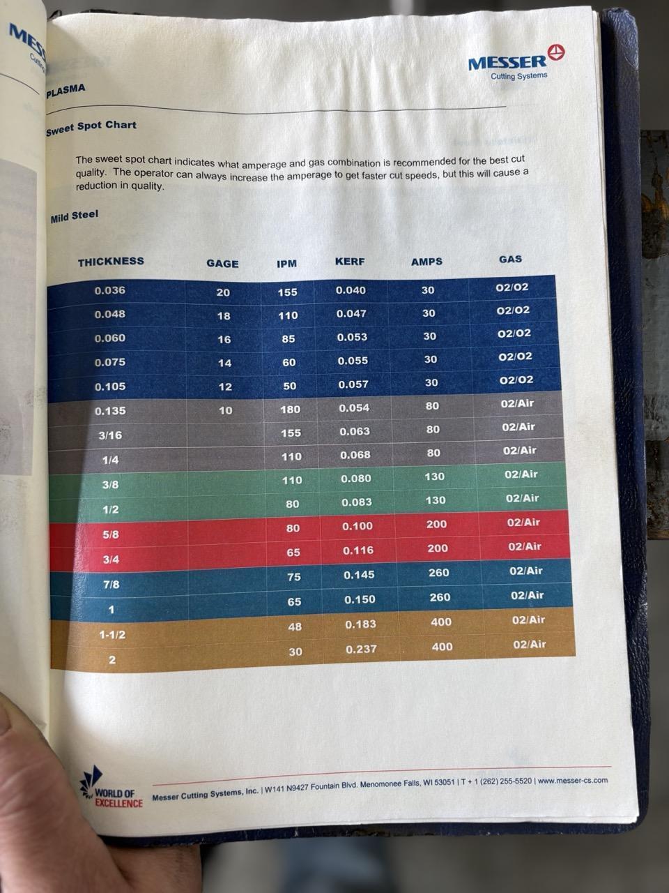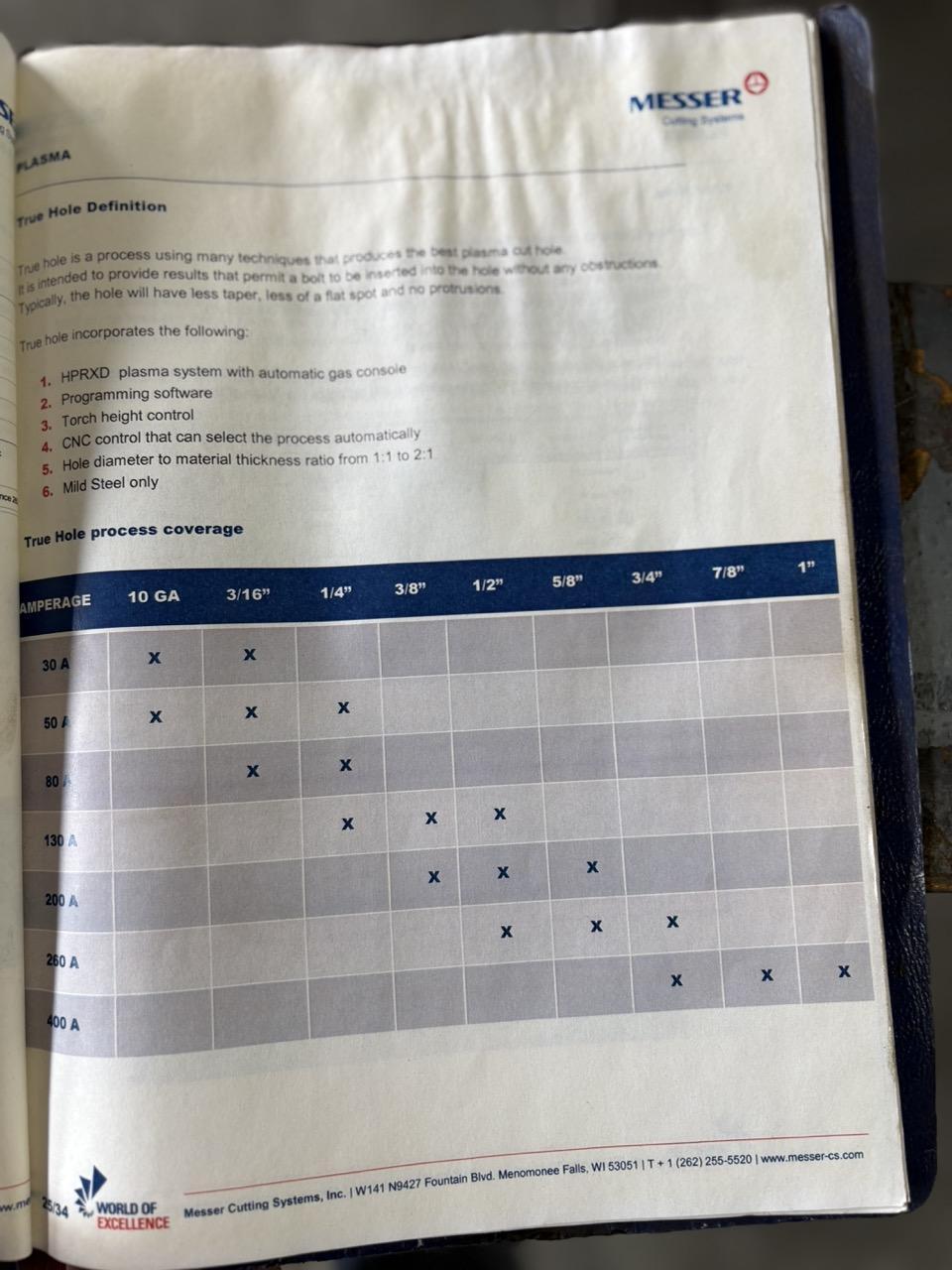 All specifications are assumed to be correct but must be confirmed by the purchasing entity.,Cutting Area: 8′ x 10′ All specifications are assumed to be correct but must be confirmed by the purchasing entity.,Plasma System: – Hypertherm HPR 260XD – High-Definition All specifications are assumed to be correct but must be confirmed by the purchasing entity.,Cutting Capacity (Hypertherm HPR 260XD): Mild Steel: – Pierce: up to 1-3/4″ – Production Cut: up to 1-1/2″ – Severance: up to 2-1/2″ Stainless Steel: – Pierce: up to 1-1/2″ – Production Cut: up to 1-1/4″ – Severance: up to 2″ Aluminum: – Pierce: up to 1-1/2″ – Production Cut: up to 1-1/4″ – Severance: up to 2″ All specifications are assumed to be correct but must be confirmed by the purchasing entity.,Controls / Software: – Messer CNC Control (MetalMaster 2.0 platform) All specifications are assumed to be correct but must be confirmed by the purchasing entity.,Table Configuration: – Downdraft Table – Heavy-Duty Steel Construction All specifications are assumed to be correct but must be confirmed by the purchasing entity. |