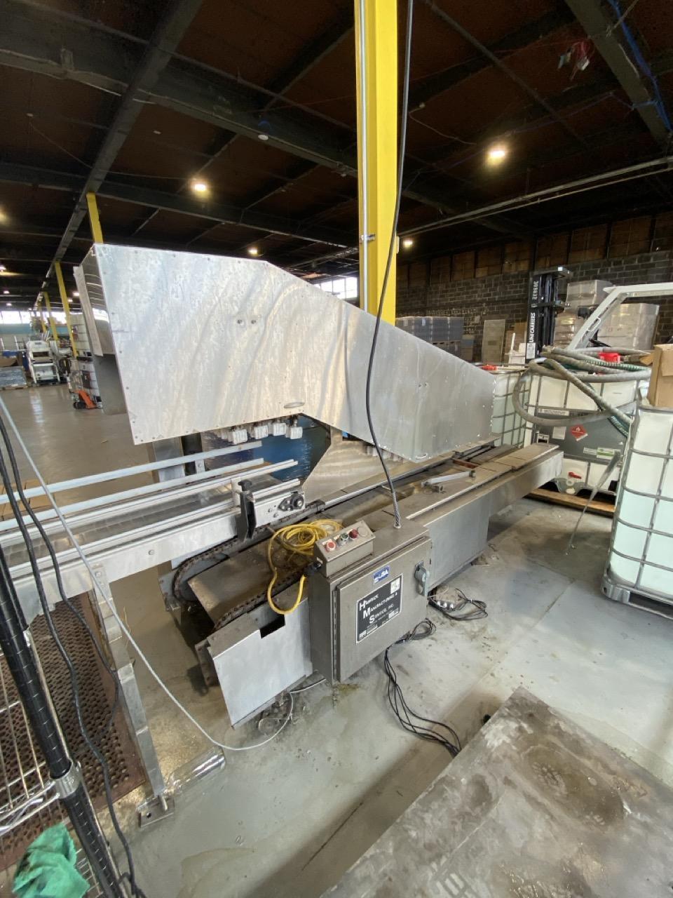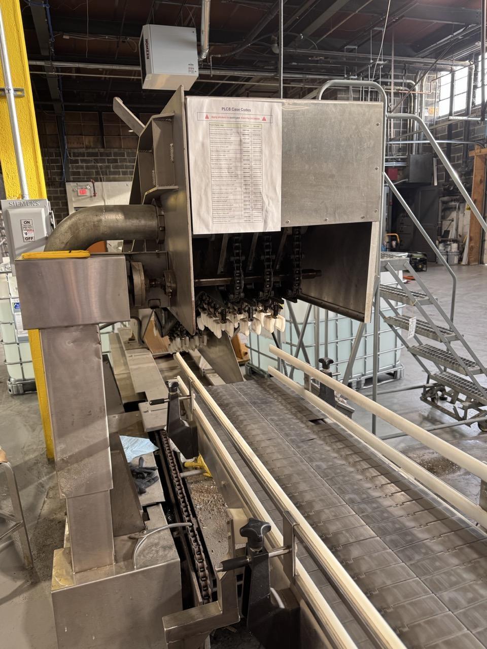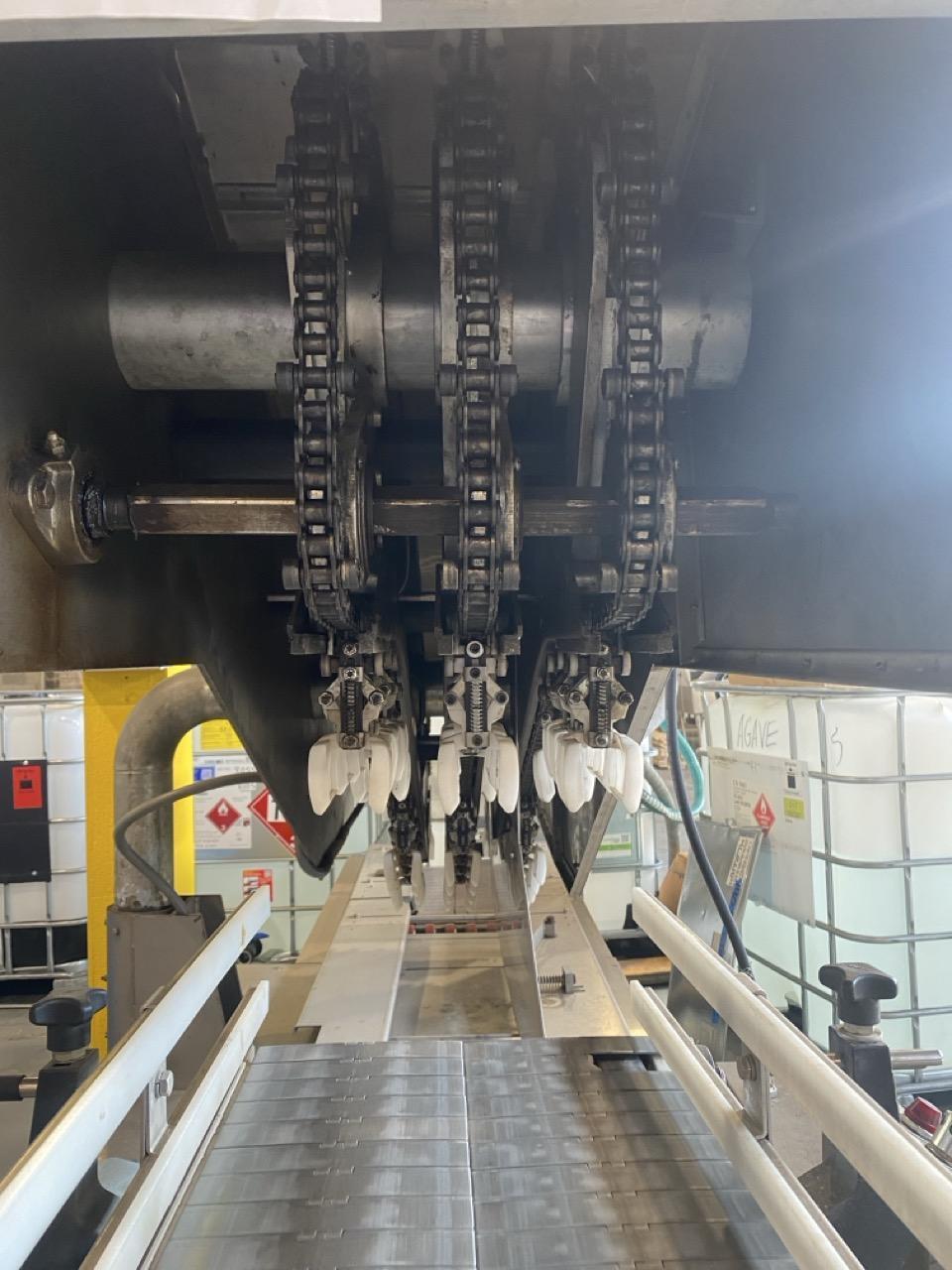 Hamrick VOC Uncaser Designed to Automatically Remove Bottles from Corrugated Cases. Products are Gently Extracted from Cases and Transferred to a Downstream Conveyor for Further Processing. Up to 35 Cycles per Minute.