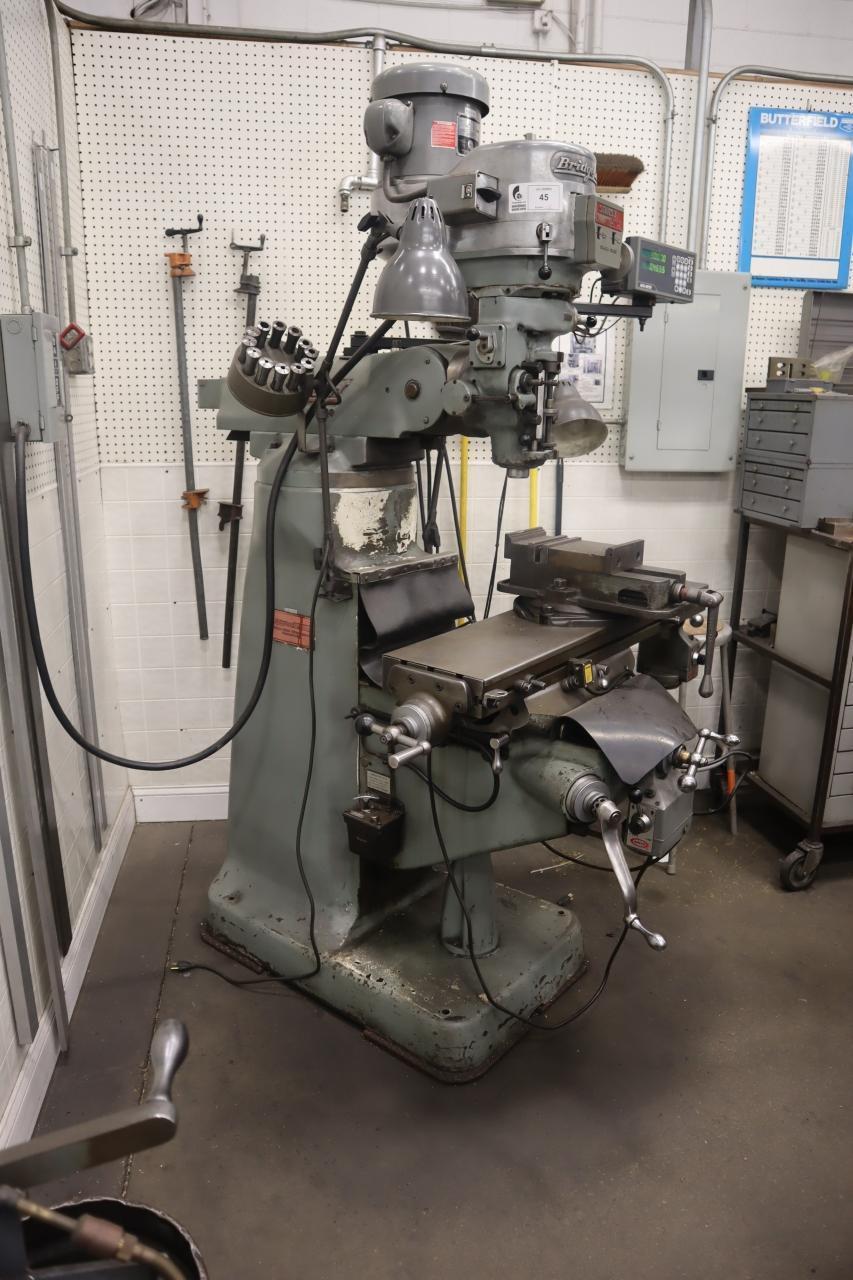 Lot 45: Bridgeport Series I Vertical Knee Mill, X & Y-Axis Servo Power Feeds, 2-Axis Acu-Rite DRO Equipped With: 9"x42" Table, Collet Racks with R8 Collets, One-Shot Lube, X & Y axis Servo Power Feeds, Knee Handle, Worklights, 2- Axis Acu-Rite Digital Readout, 6" Kurt Vise on Swivel Base, Hold Down Gear, Manuals/NOTE: Power Quill Feed Currently Non-Operational Electrics: 220/230/440/460 Volt, 3 Phase Manufacturer: Bridgeport Model: Series I Year: 1977 Serial Number: 185504 Main Unit Approx Weight: 2500.00 lbs Main Unit Dimensions (in inches): Length: 58.00" Width: 50.00" Height: 78.00" Specs: Table Size: 9" x 42 Longitudinal Travel: 30" for 42" Table / 36" for 48" Table Cross Travel: 12" Quill Travel: 5" Hand or Power Feed Knee Travel: 16" Power Quill Feeds: (3) .0015 / .003 / .006 IPR Spindle Taper: R-8 Spindle Speeds: 60-4200 RPM Variable Spindle Nose to Table Min-Max: 2.5" - 18.75" Spindle Drive: 2 HP Spindle Center to Column Distance: 6.75" - 18.75" Overarm Ram Adjustment: 12" Manual Adjustment Max Table Load: 750 Lbs. Head Swivel Left to Right: +/- 90 Degrees Head Tilt Front to Back: +/- 45 Degrees Seller Company: Sico North America Inc Seller Contact: John Ihrke Phone: (952) 941-1700 Item Location: Sico North America Inc, 7525 Cahill Rd, Edina, MN 55439 Location Contact: John Ihrke Phone: (952) 941-1700 Inspection Date & Time: By Appointment Normal Business Hours Monday-Friday Removal Dates and Times: This item must be removed between Tuesday, March 17, 2026 and Friday, March 27, 2026