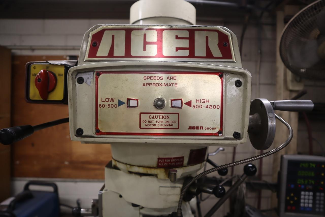 Lot 65: Acer Ultima 3VK Vertical Knee Mill, Newall 3-Axis DRO, X & Y-Axis Servo Power Feeds, Power Quill Feed Equipped With: 10"x50" Table, Variable Speed Spindle 60-4200 RPM, R8 Spindle Taper, Newall 3-Axis Digital Readout, X-Axis and Y-Axis Servo Power Feeds, One Shot Lube, Collet Rack with R8 Collets, Power Quill Feed and Handle, Knee Handle, 6" Kurt Vise on Swivel Base, Worklights Electrics: 220/440 Volt, 3 Phase Manufacturer: Acer Model: Ultima-3VK Year: 1998 Serial Number: 98010042 Main Unit Approx Weight: 3300.00 lbs Main Unit Dimensions (in inches): Length: 78.00" Width: 74.00" Height: 87.00" Specs: Table Size: 10" x 50" Spindle Taper: R8 Spindle Speeds: 60-4200 RPM Spindle Drive: 3 HP Seller Company: Sico North America Inc Seller Contact: John Ihrke Phone: (952) 941-1700 Item Location: Sico North America Inc, 7525 Cahill Rd, Edina, MN 55439 Location Contact: John Ihrke Phone: (952) 941-1700 Inspection Date & Time: By Appointment Normal Business Hours Monday-Friday Removal Dates and Times: This item must be removed between Tuesday, March 17, 2026 and Friday, March 27, 2026