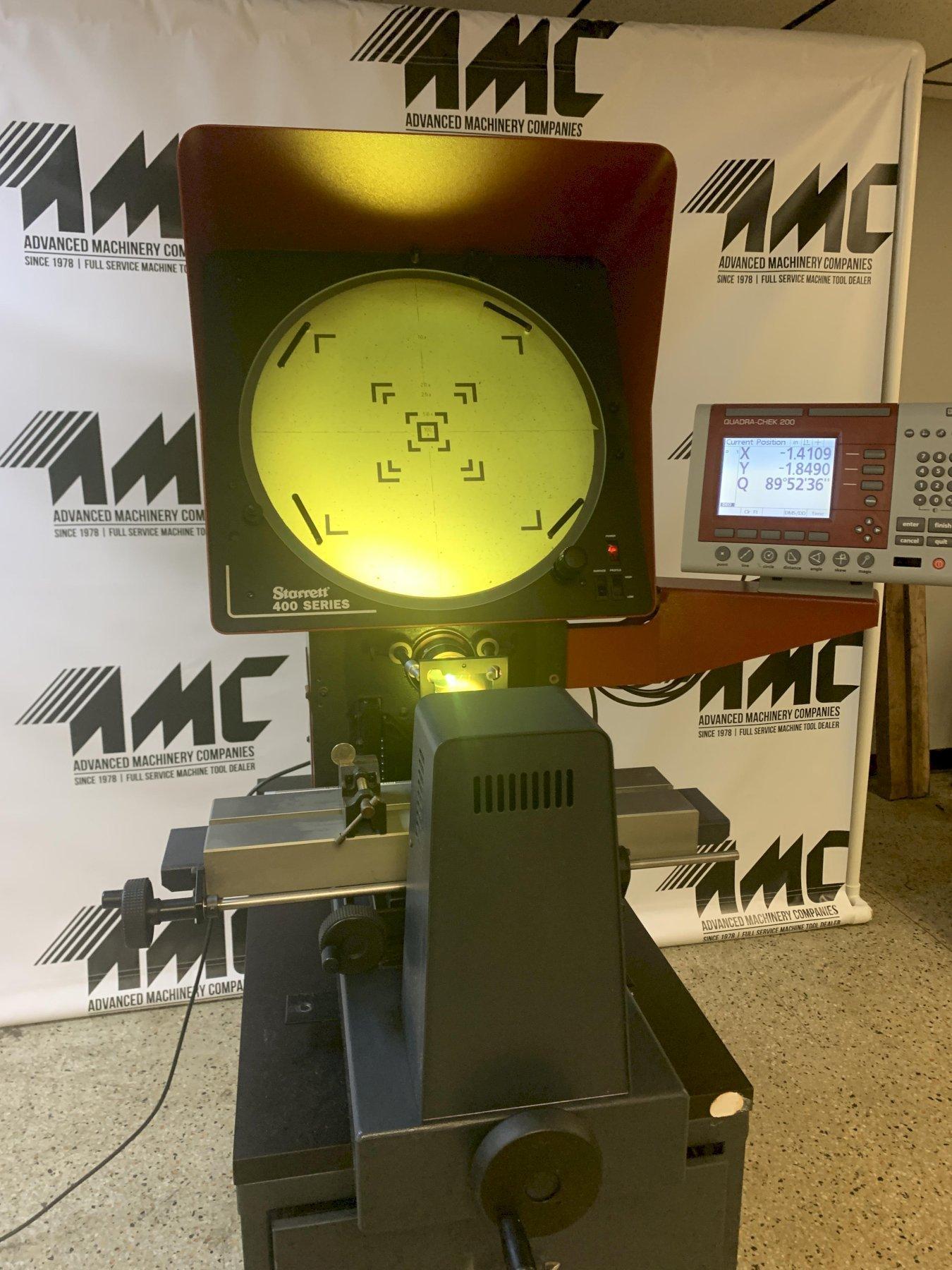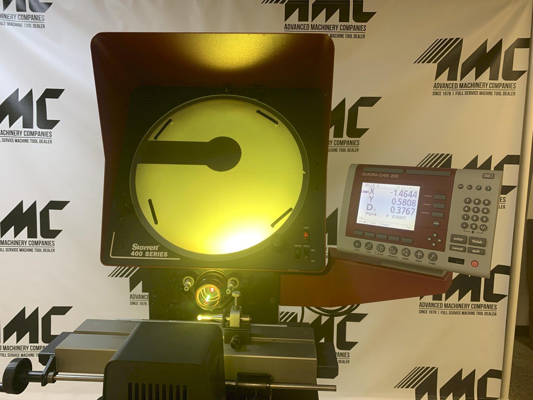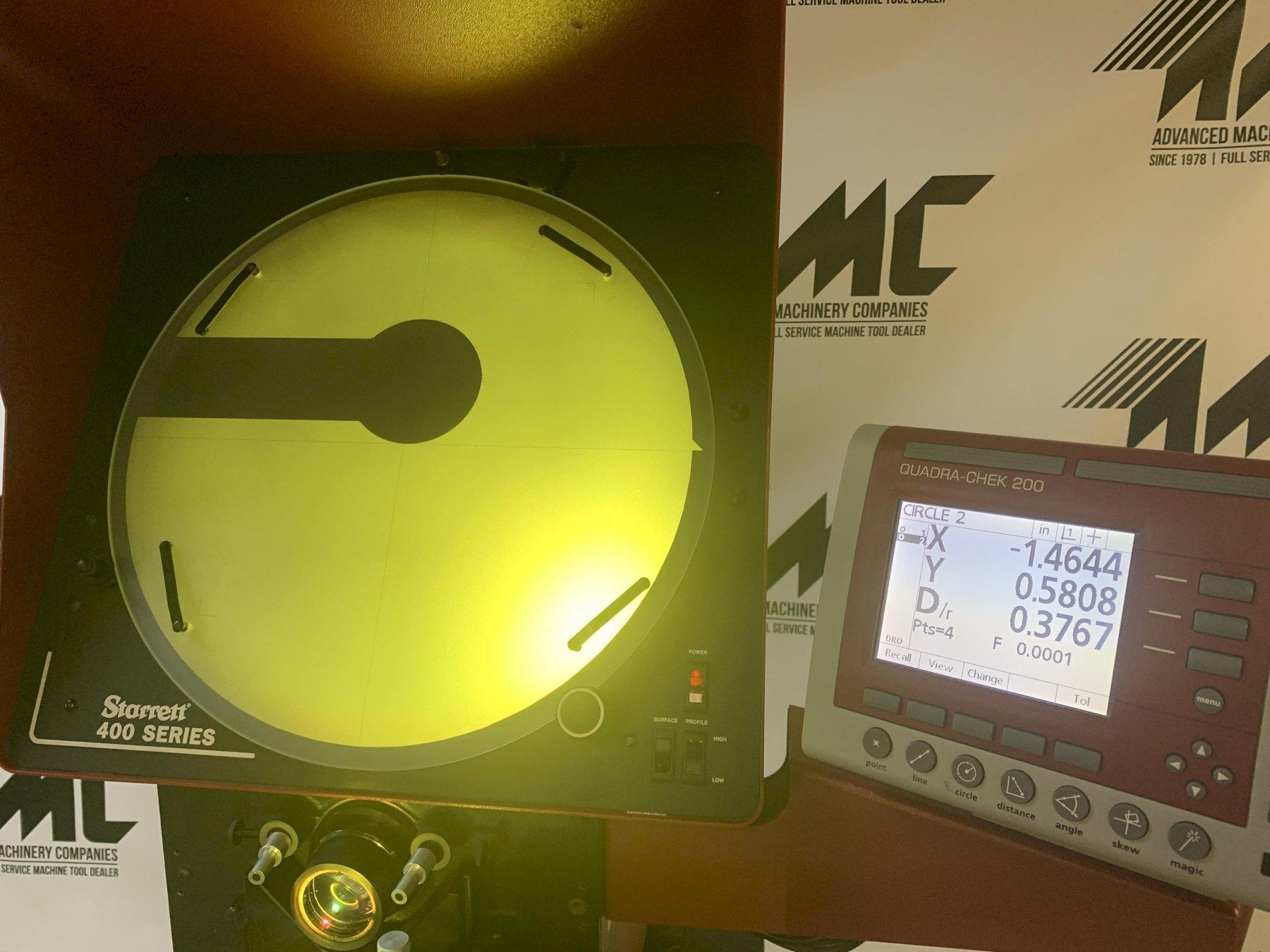 Screen Diameter - 16" Table Size - 4.7" x 18.9" Measuring Travels - 10" x 4" Focus Travel - 1.5" Table Load Capacity - 55 Lbs. Image - Inverted and Reversed Electrics - 1/60/115 V Dimensions - 34" LR x 44.8" FB x 37.4" H Net Weight, Approx - 200 Lbs. Gross Shipping Weight, Approx - 375 Lbs. Equipped with: Quadra Chek 200 Computational Digital Readout Q-Axis for Digital Angle Measuring Fiber Optic Surface Reflection Single Lens Mount with (1) 10X Lens Quick Release Table for Fast Position on X-Axis Travel Integral Hood Factory Cabinet Base Green Contrast Filter Operators Manuals Specifications subject to independent verification by the buyer. This machine has been serviced and recently passed calibration. It is fully functional and in good working condition. Buyer should have calibrated again after transport.