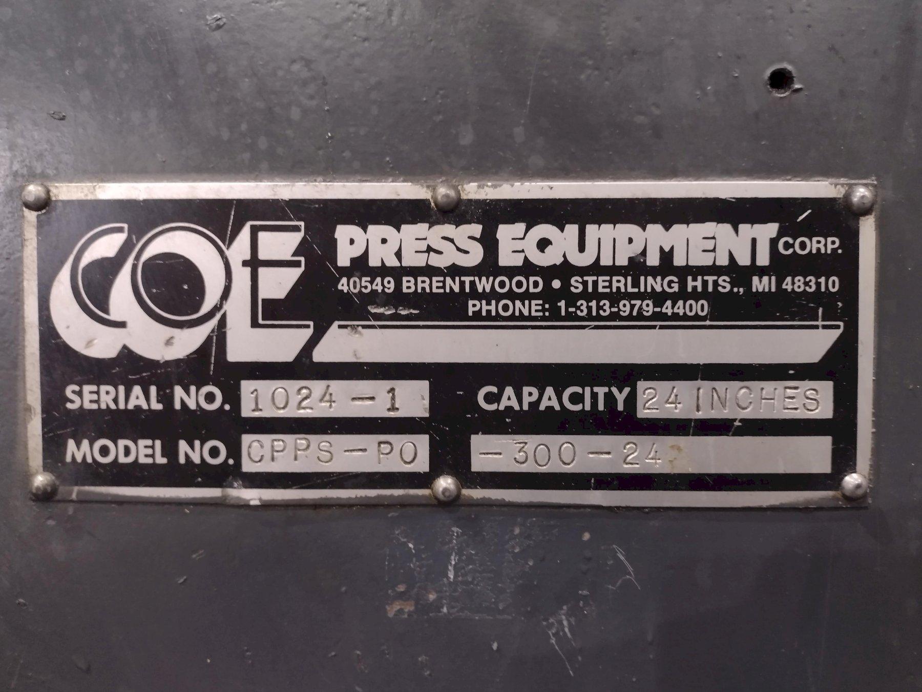 SERIAL 1024-2 MODEL CPR-DE-PO-8024 CAPACITY 8,000 LBS PER SIDE COIL WIDTH 24" COIL ID 18" TO 21" ID ADJUSTMENT MANUAL COIL OD 72" BACKER PLATE 60" PULL OFF NON MOTORIZED STRAIGHTENER: SERIAL 1024-1 MODEL CPPS-PO-300-24 CAPACITY, WIDTH 24" BREAKER ROLLS DIAMETER 3"