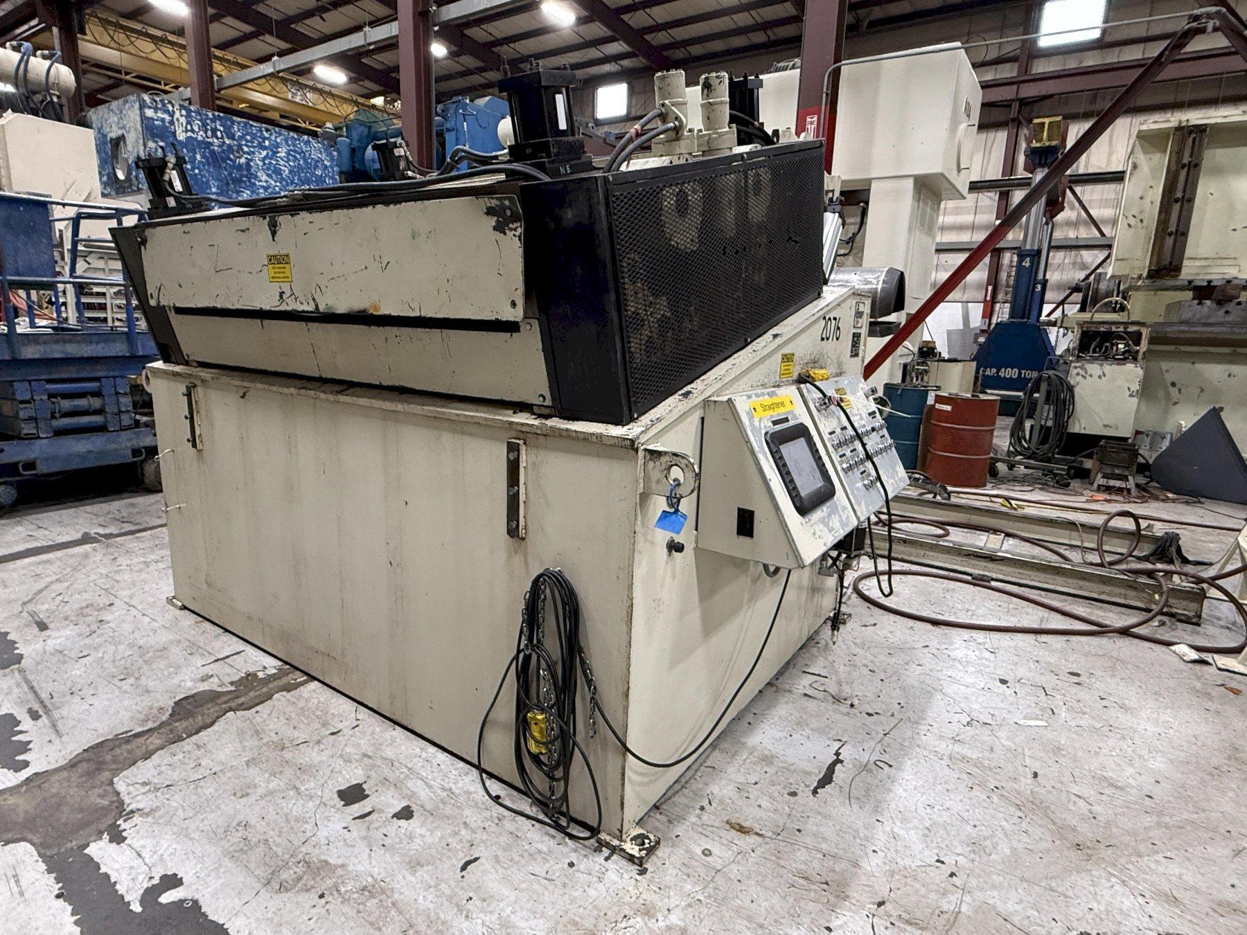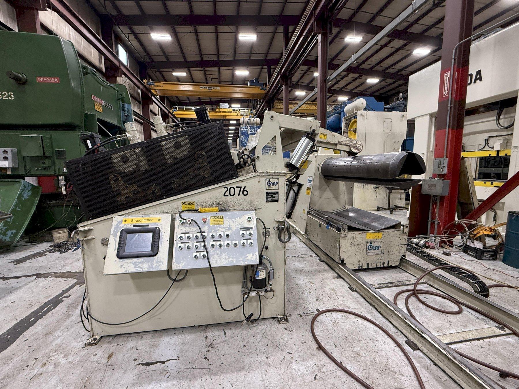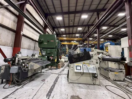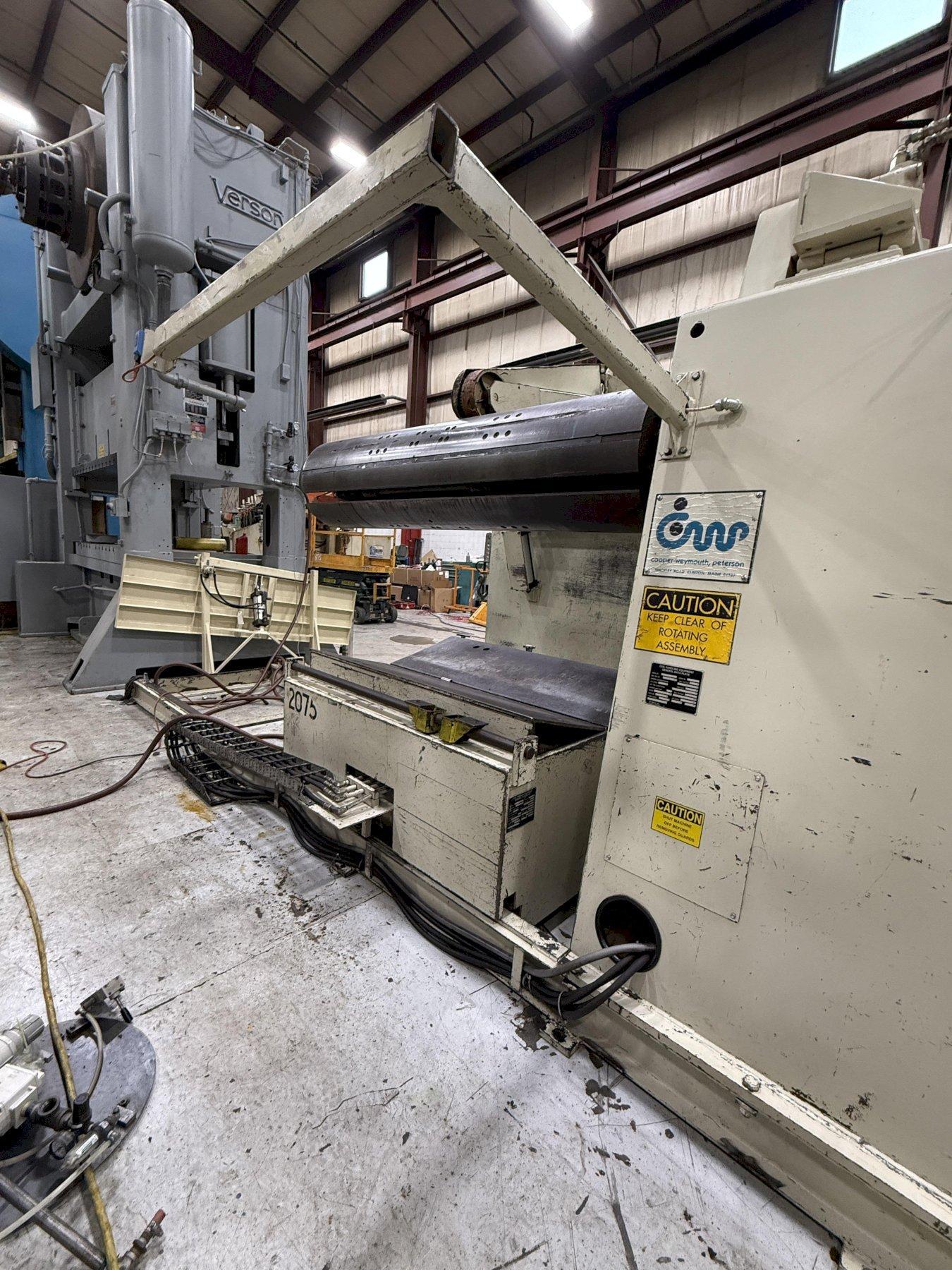 Cooper, Weymouth, Peterson (CWP)"Conventional" Servo Coil Feed Line72 inch Wide x .125 inch Capacity CWP Coil Reel Model No. 8R-72 CWP Powered Coil Straightener Model No. HD72-63PDS11 CWP Servo Roll Feed Model No. SMX72-H6-RET Maximize your stamping productivity with this heavy-duty CWP (Cooper Weymouth Peterson) Conventional Servo Coil Feed Line. Designed for high-volume operations, this 72" wide coil line features a 30,000 lbs. capacity and handles stock thicknesses up to .125" at full width and .285" at 24" widths. The system includes a CWP 8R-72 Coil Reel with a traveling load car, a Model HD72-63PDS11 Straightener featuring 11 backed-up rolls for precision flatness, and a SMX72-H6-RET Servo Roll Feed with 6" diameter rolls and SE Series AC servo controls. Built for durability and precision, this CWP feed line offers a 75 FPM line speed and automated lubrication. Contact S&G Press today to secure this high-capacity used coil processing equipment for your facility. |