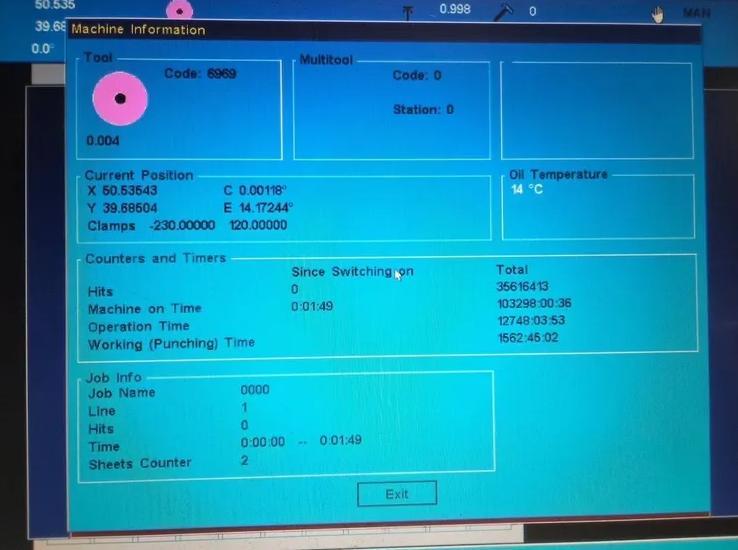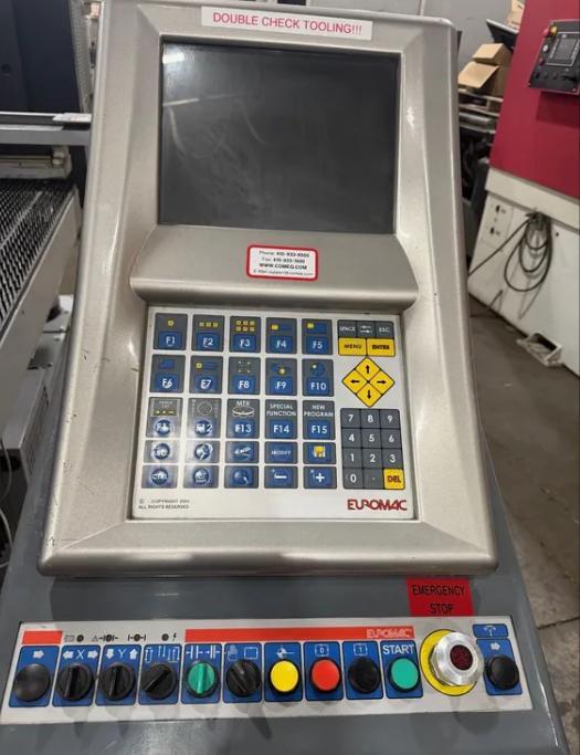 33 Tons, 40” X 50” CNC Turret Punch with Euromac CNC Control, Accepts up to a 10 Station Multi Tool, 360° Bi-Directional Rotation of Tooling and Brush Table.